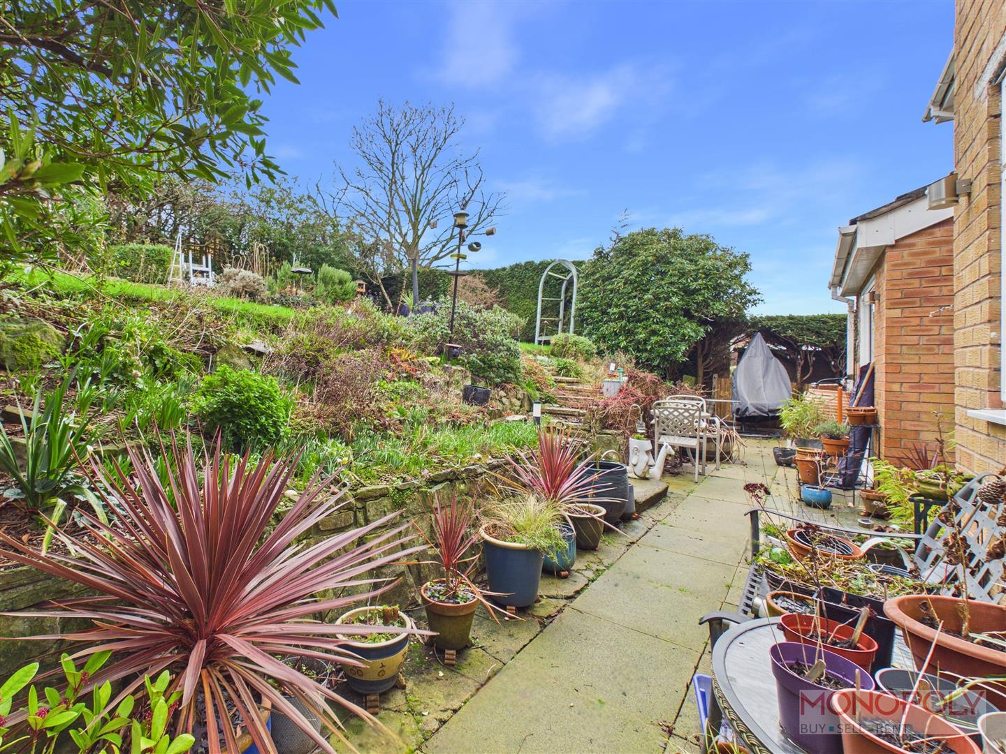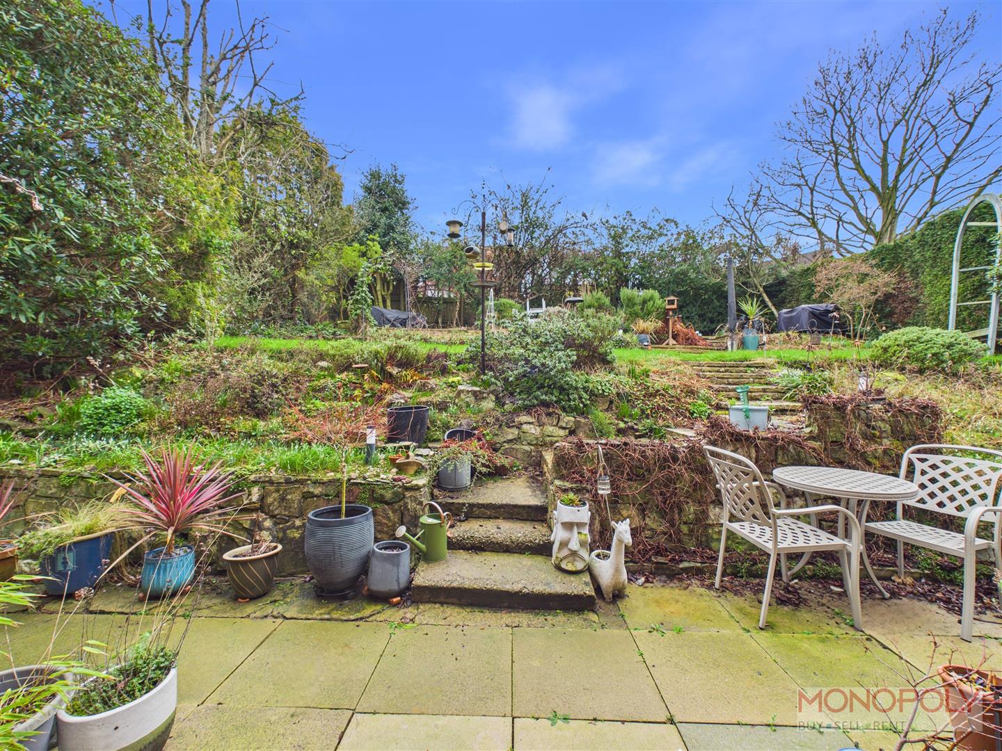 To the rear is an impressive tiered garden with a patio bordered by established shrubberies and raised beds, which wraps around both sides of the property. One side houses a storage shed, while the other provides an Electric Vehicle charging point, a gate to the front of the property, a pedestrian door offering access to the utility room, and a log store. Steps lead up to the second level, mainly laid to lawn with a slabbed path, which then leads to the third tier featuring a patio surrounded by mature trees and well-established shrubberies, creating a peaceful and private outdoor retreat.