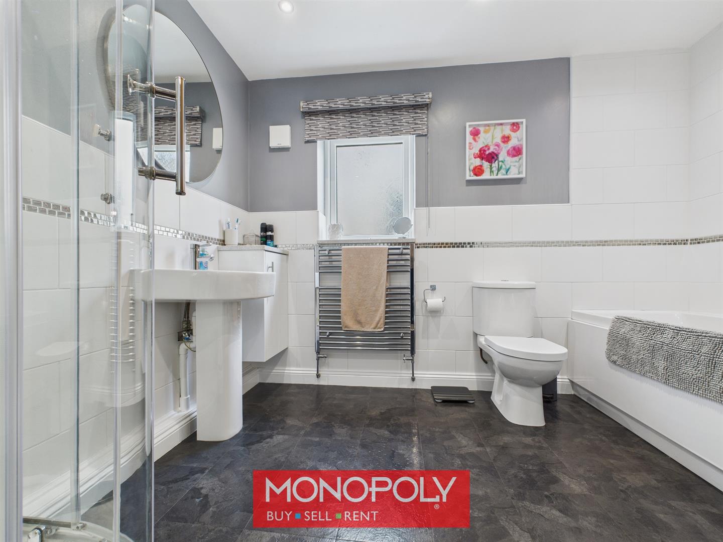 A generous four-piece suite comprising a full-size bath with central mixer and shower attachment, pedestal washbasin, low flush WC, and corner shower unit with PVC glitter splashbacks and thermostatic shower. Finished with part-tiled walls and mosaic border, vinyl tiled flooring, chrome towel rail, downlights, and privacy window with granite sill.