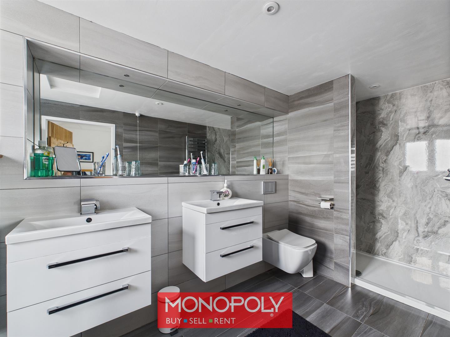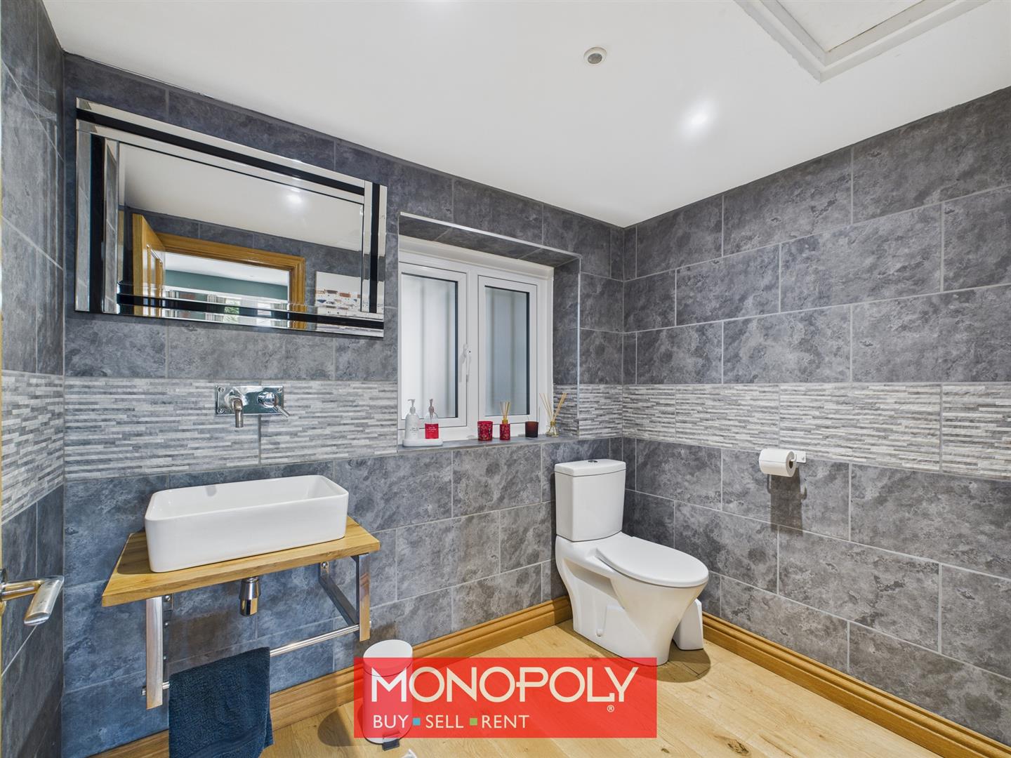 This contemporary En Suite is finished to a high standard with sleek tiled flooring and walls throughout. It features a stylish walk-in shower with splash panels, twin floating sink units with drawers, and a matching floating toilet for a streamlined look. A large mirror with downlights enhances the sense of space, while a newly fitted frosted double-glazed window offers both light and privacy. Additional touches include a towel point, loft access hatch, and a characterful wooden ledged door.