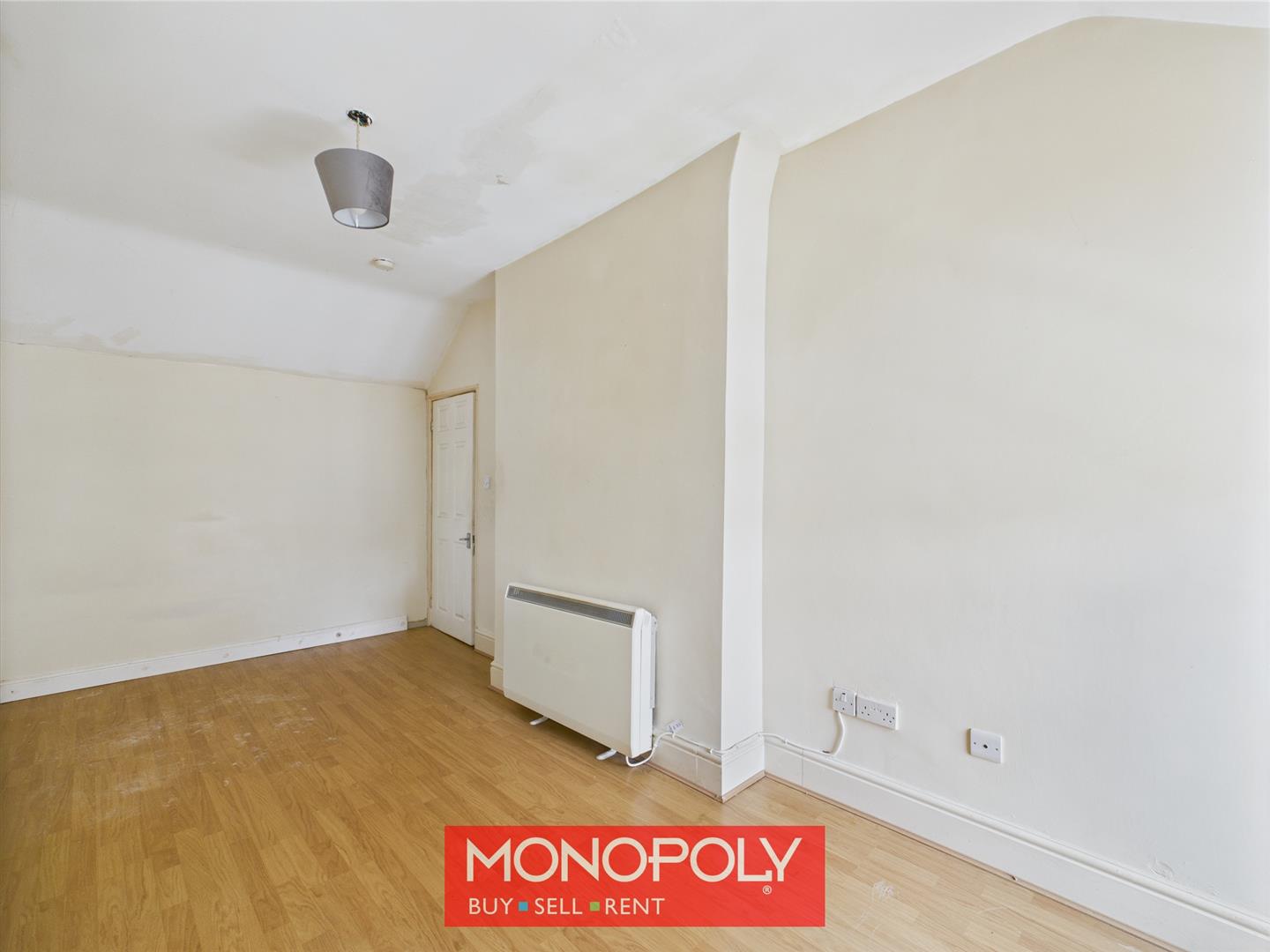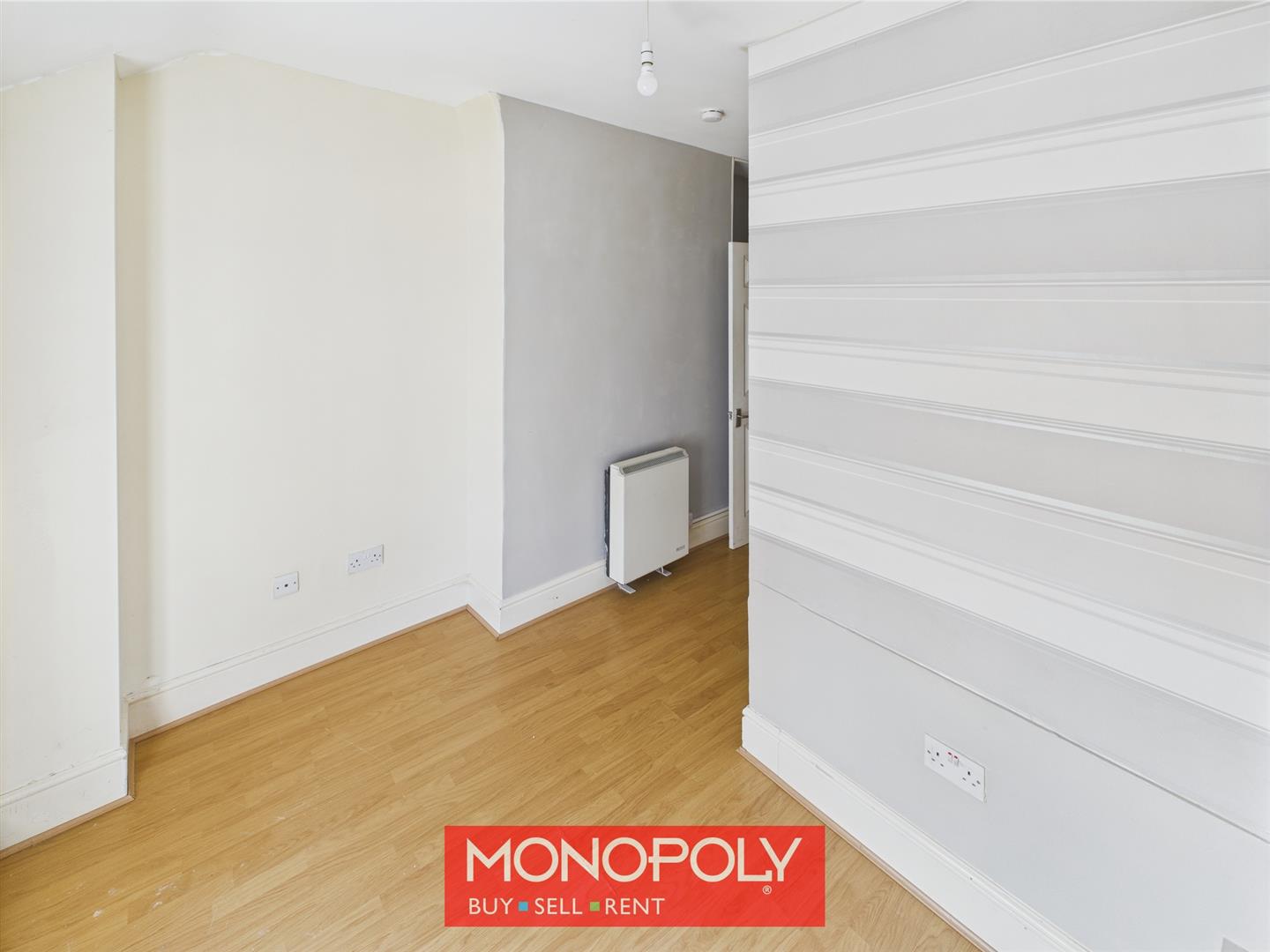 This double bedroom has a sash window at the front allowing in natural light. It has wood-effect laminate flooring, a storage heater for added comfort, and a painted wooden door leading to the hallway.