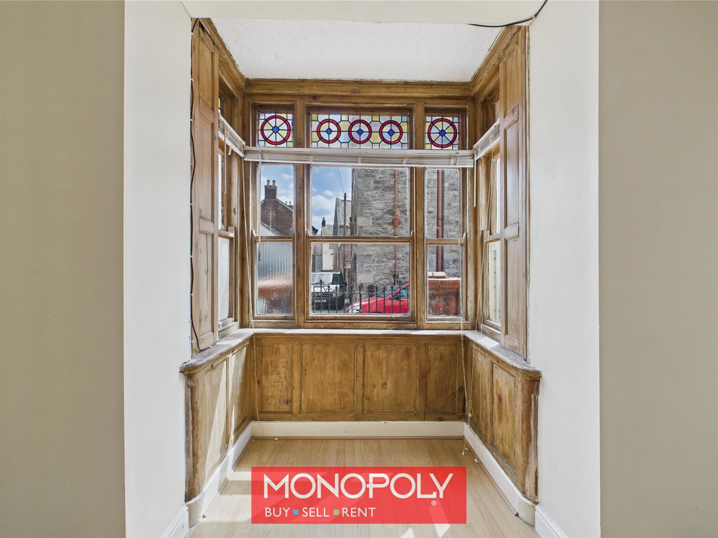 This lounge is bright and airy, with dual-aspect wooden sash windows that let in plenty of light. It features wood-effect laminate flooring, a storage heater for warmth, and a painted wooden door that leads to the landing.