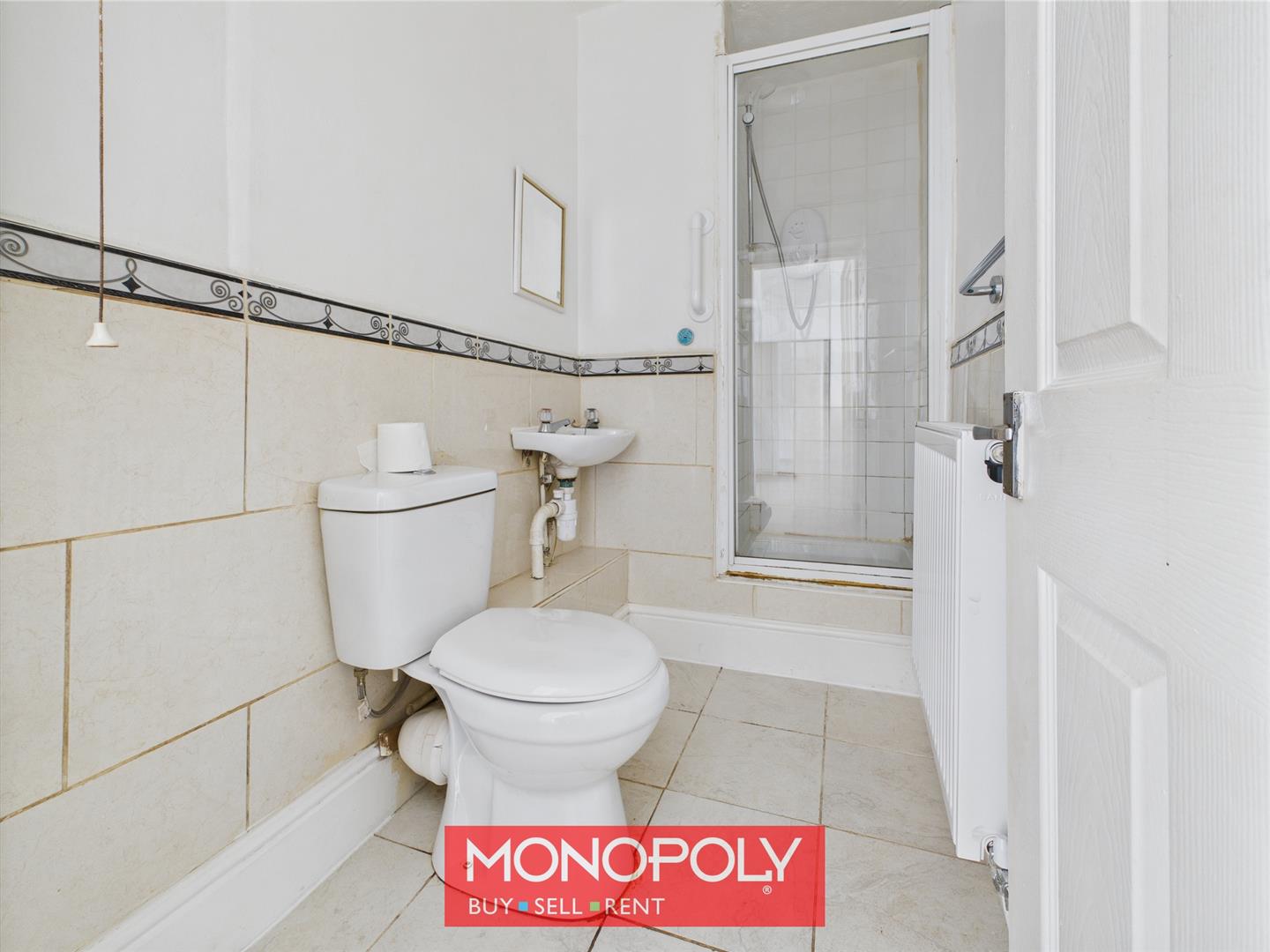 This bathroom offers a clean and practical space with tiled flooring and partially tiled walls. The tiled shower features a glass door, and an extractor fan ensures ventilation. A radiator provides warmth, and a wooden door leads through to the lounge.