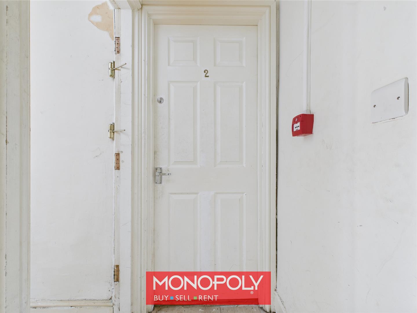 This dual-aspect lounge is filled with natural light from its wooden sash windows. It has wood-effect laminate flooring, a storage heater for warmth, and a painted wooden door that opens to the hallway.