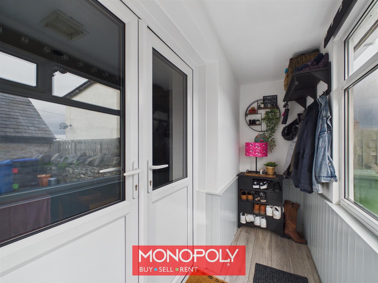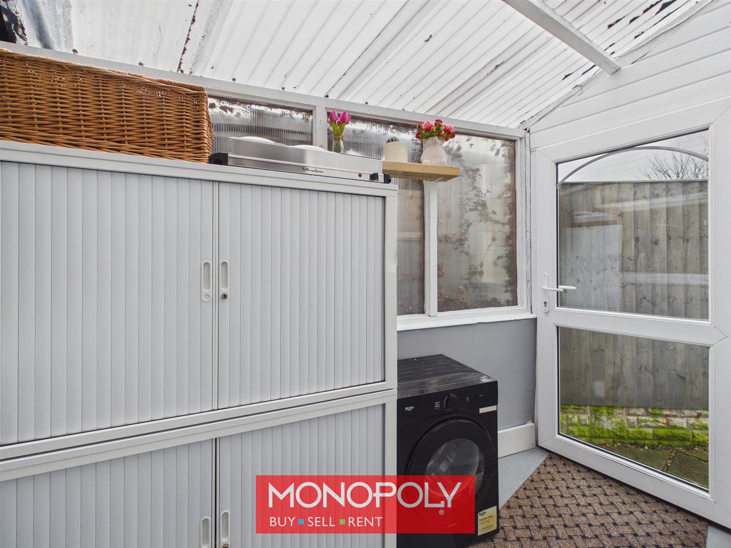 A practical rear porch with vinyl flooring, offering useful storage and utility space. Featuring a polycarbonate-style roof, double glazed rear door, and corrugated glazed side windows, this is a handy and functional transition area between the house and garden.