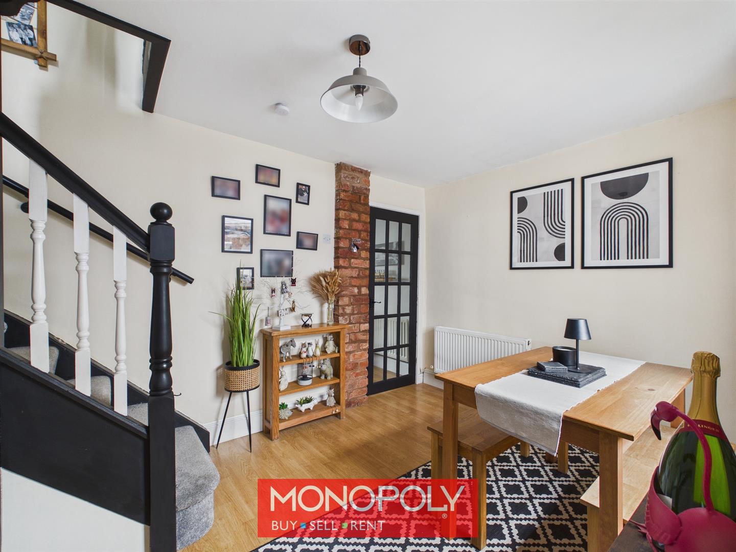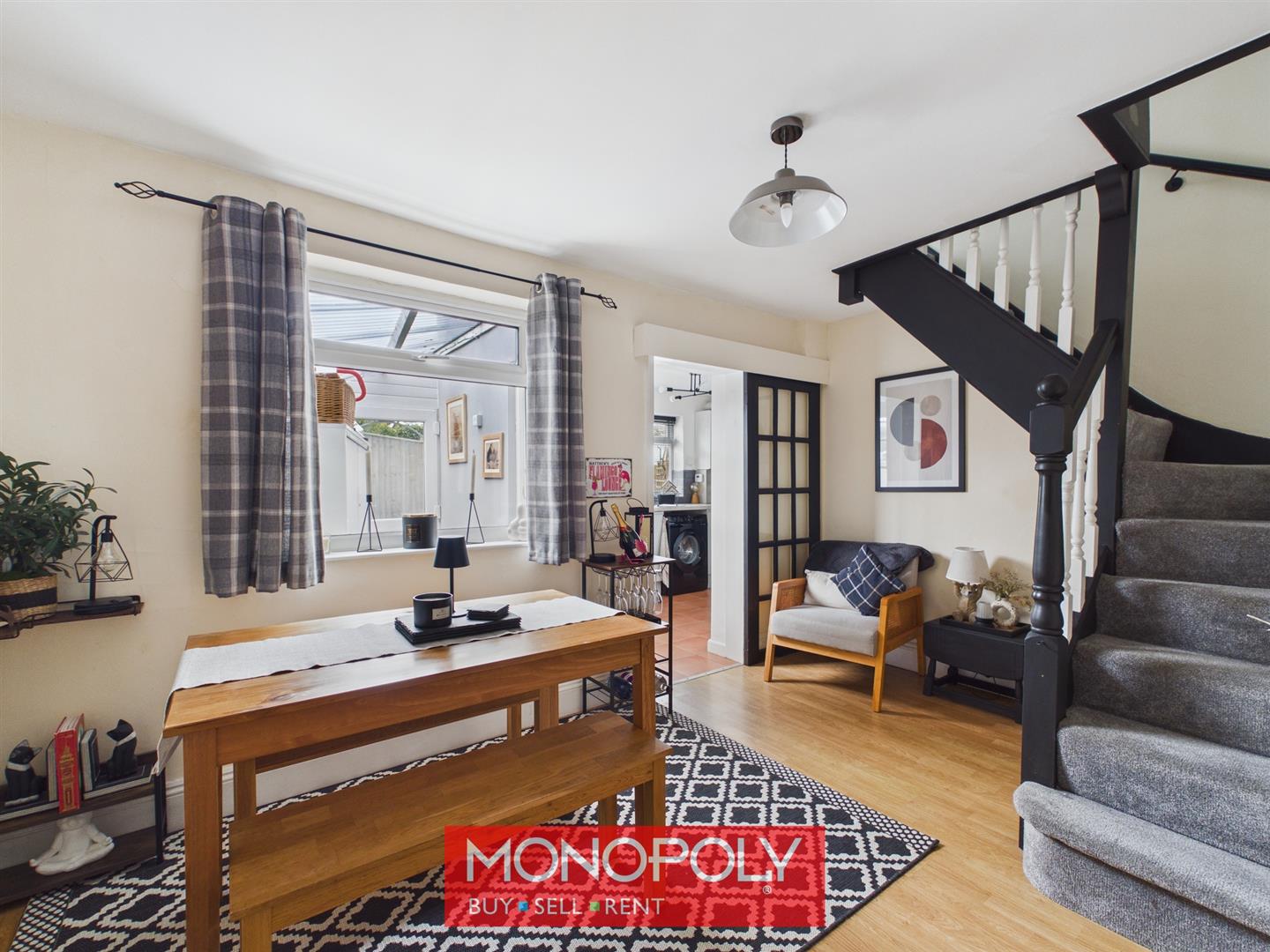 A versatile and well-proportioned second reception area, ideal for family dining or entertaining. It benefits from laminate flooring, a radiator, and a rear-facing window. Stairs rise to the first floor with traditional spindle balustrading, with a useful storage cupboard beneath. A sliding door connects the dining room to the kitchen, creating a practical flow through the ground floor.