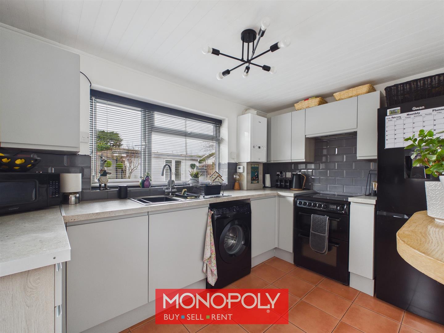 The kitchen is fitted with a modern range of light grey units, complemented by granite-effect worktops and contemporary tiled splashbacks. A stainless steel sink with mixer tap is positioned beneath a rear-facing window, while there is an electric oven, space for a tall fridge freezer, and plumbing for a washing machine. Further features include a tiled floor, timber-effect ceiling, radiator with shelf above, and a wall-mounted Ideal combi boiler. A charming barn-style door with glazed panel opens into the rear porch, with an internal door leading to the shower room.
