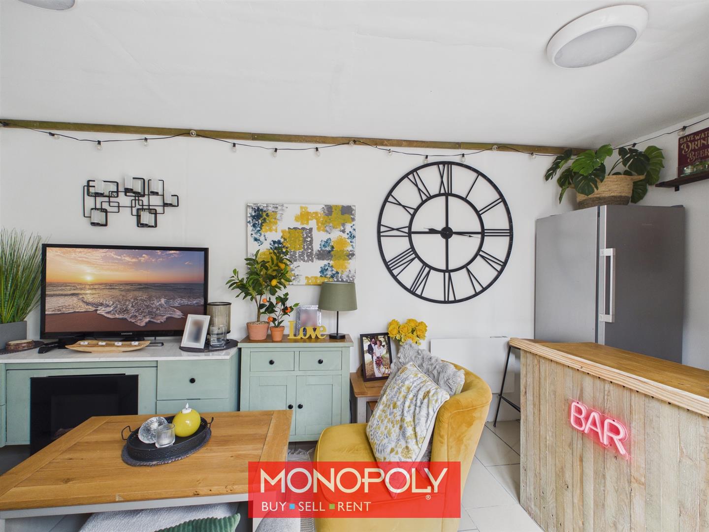 A superb addition to the property, this versatile garden room provides excellent additional reception space suited to a variety of uses. Finished with tiled flooring, it features an electric wall heater, built-in storage cupboard, and bar area. Ceiling lighting and French doors create a bright and welcoming atmosphere, making it an ideal space for entertaining, hobbies, home working, or simply relaxing.
