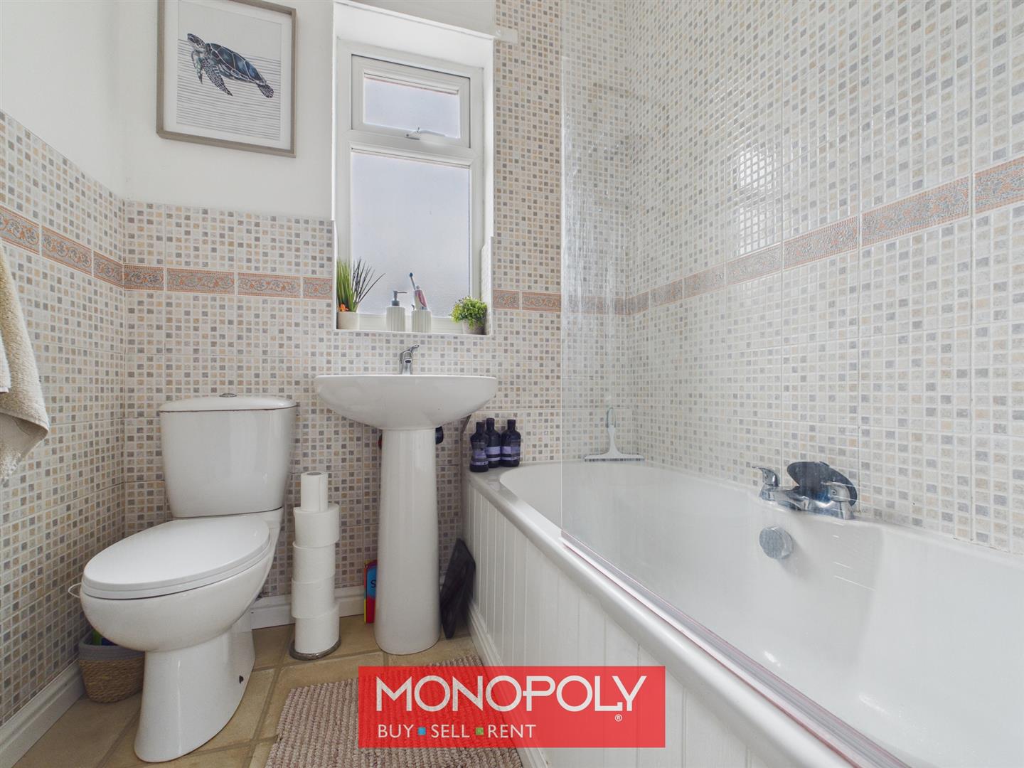 Attractively appointed and comprises a full-sized bath with thermostatic shower over and fitted screen, low flush WC, and pedestal wash hand basin. The room features tiled flooring, mosaic-effect part tiled walls, a chrome towel rail, and a privacy window.