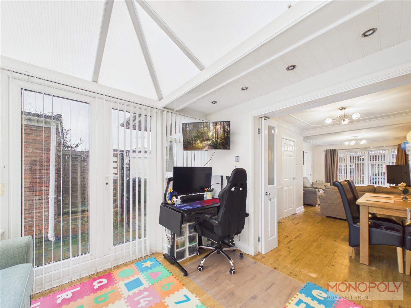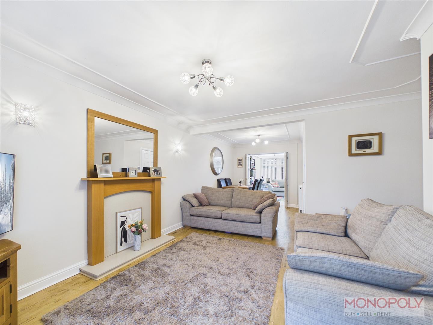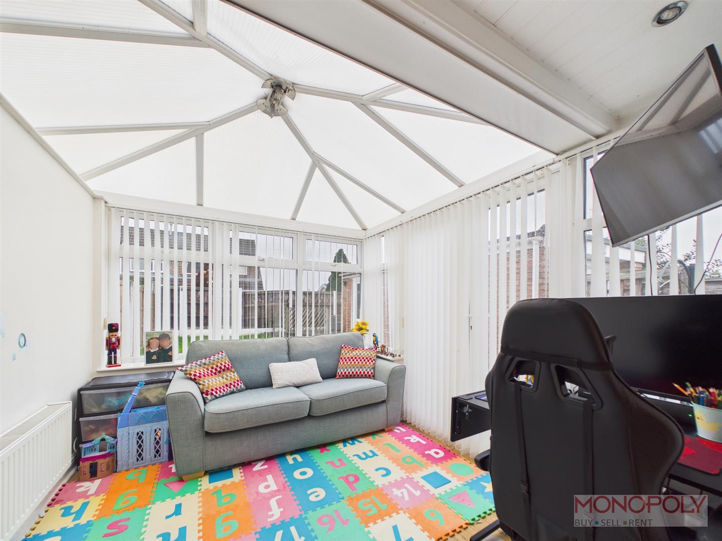 A generous living space with window to front, wood effect floor, storage cupboard, door to kitchen, double doors to conservatory.