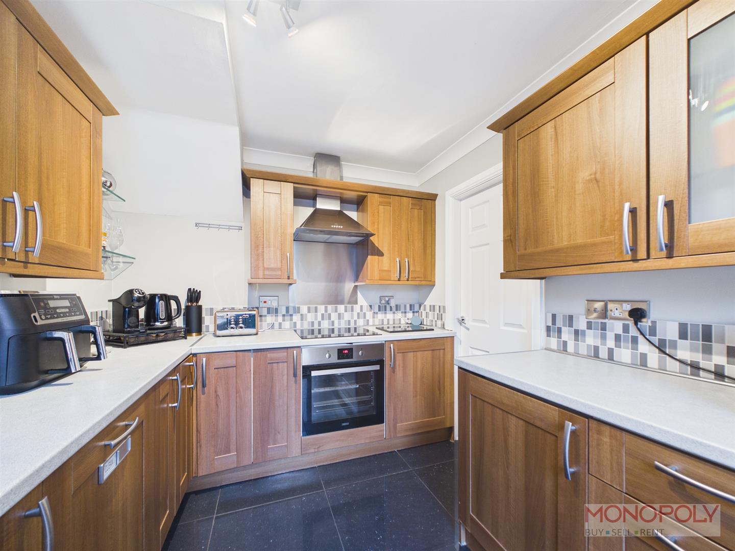A fitted range of wall and base units, complementary worktops, single oven, electric hob, extractor, tiled splashback, stainless sink/drainer, wall mounted gas combi boiler, space for washing machine, window and external door to rear. Tiled floor.