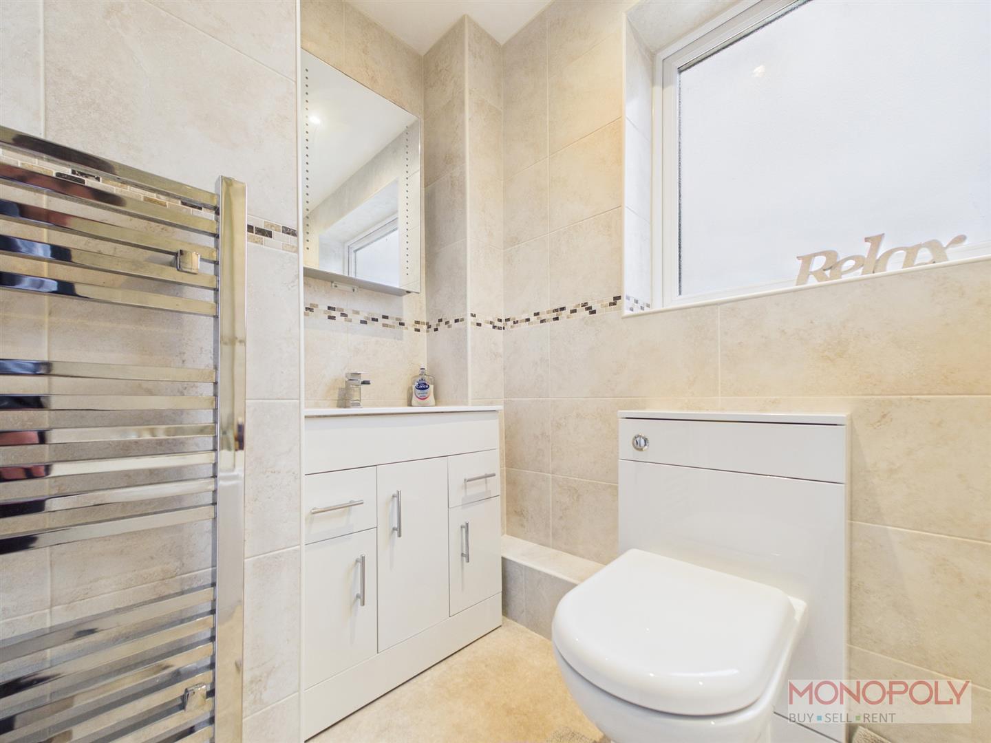 P shape bath with mains shower over, shower screen, wc, hand wash basin set in vanity. Chrome towel rail. Tiled walls and floor. Wall mounted bathroom cabinet. Spotlights.