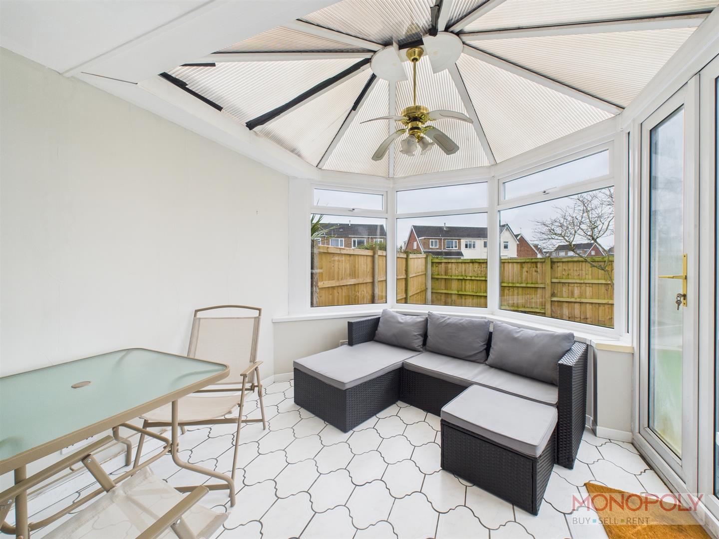 UPVC double glazed windows and doors, tiled flooring, power sockets, ceiling light with fan.