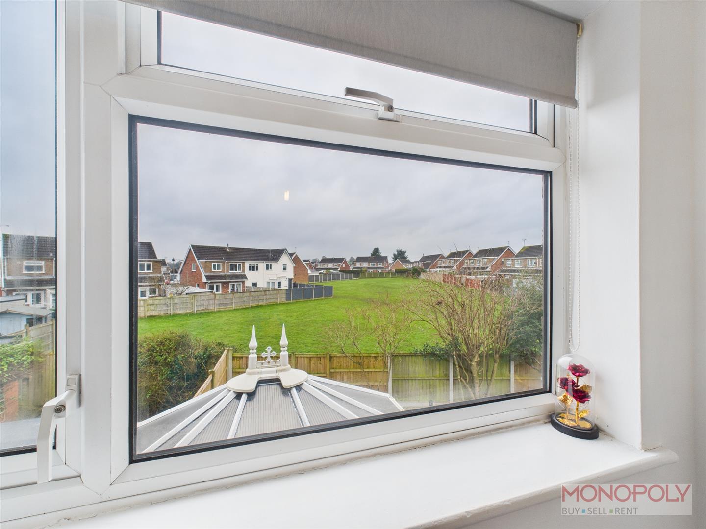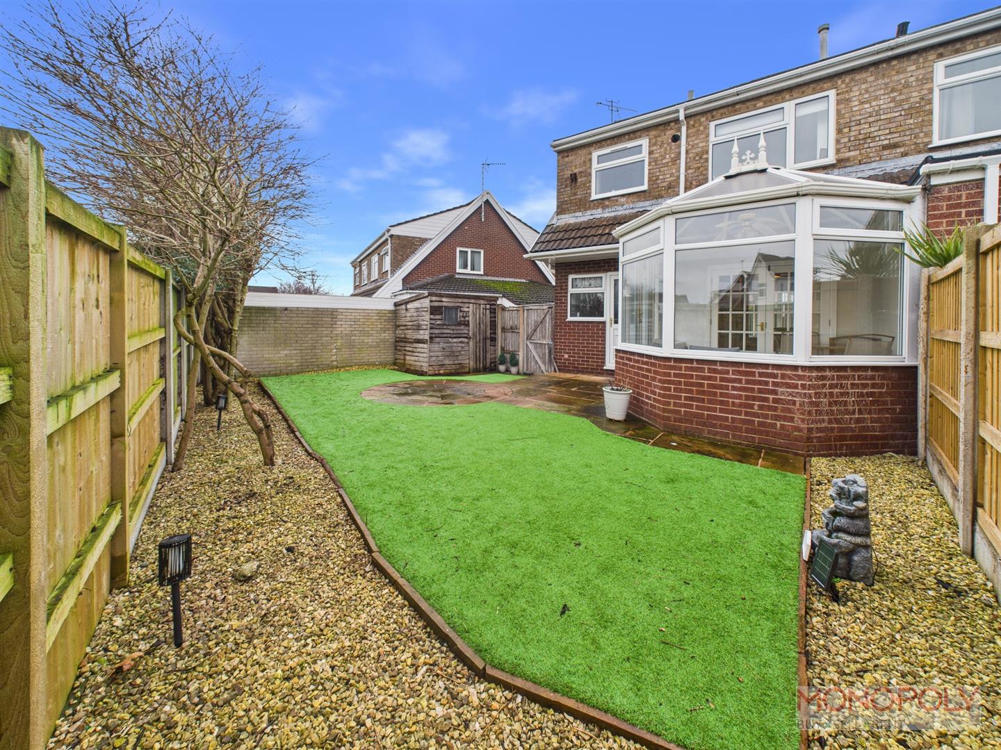 To the front is a lawned garden area and driveway leading to a timber fence providing access to the rear. The rear garden is south facing and has been landscaped with artificial grass, paving and decorative stone to the borders with established trees. To the borders are fence panels for security and privacy. There is a field beyond to the rear.
