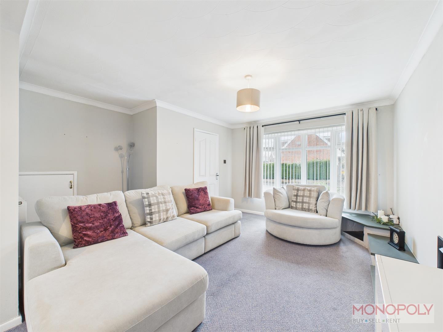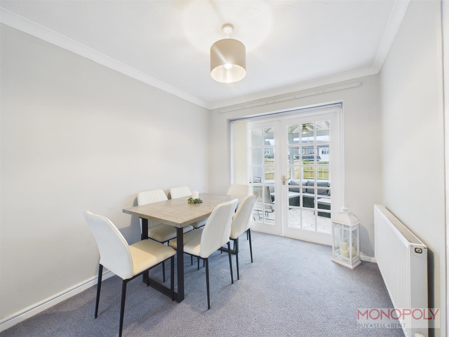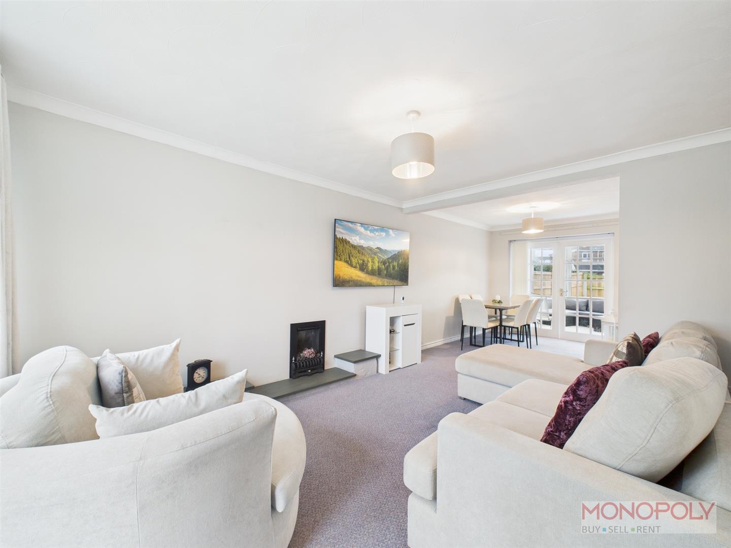 UPVC double glazed bay window to the front elevation. Under the stairs storage cupboard, fireplace with built in shelving, opening into dining area with carpet flooring throughout, two panelled radiators, two ceiling light points, door into kitchen and glazed double doors into conservatory.