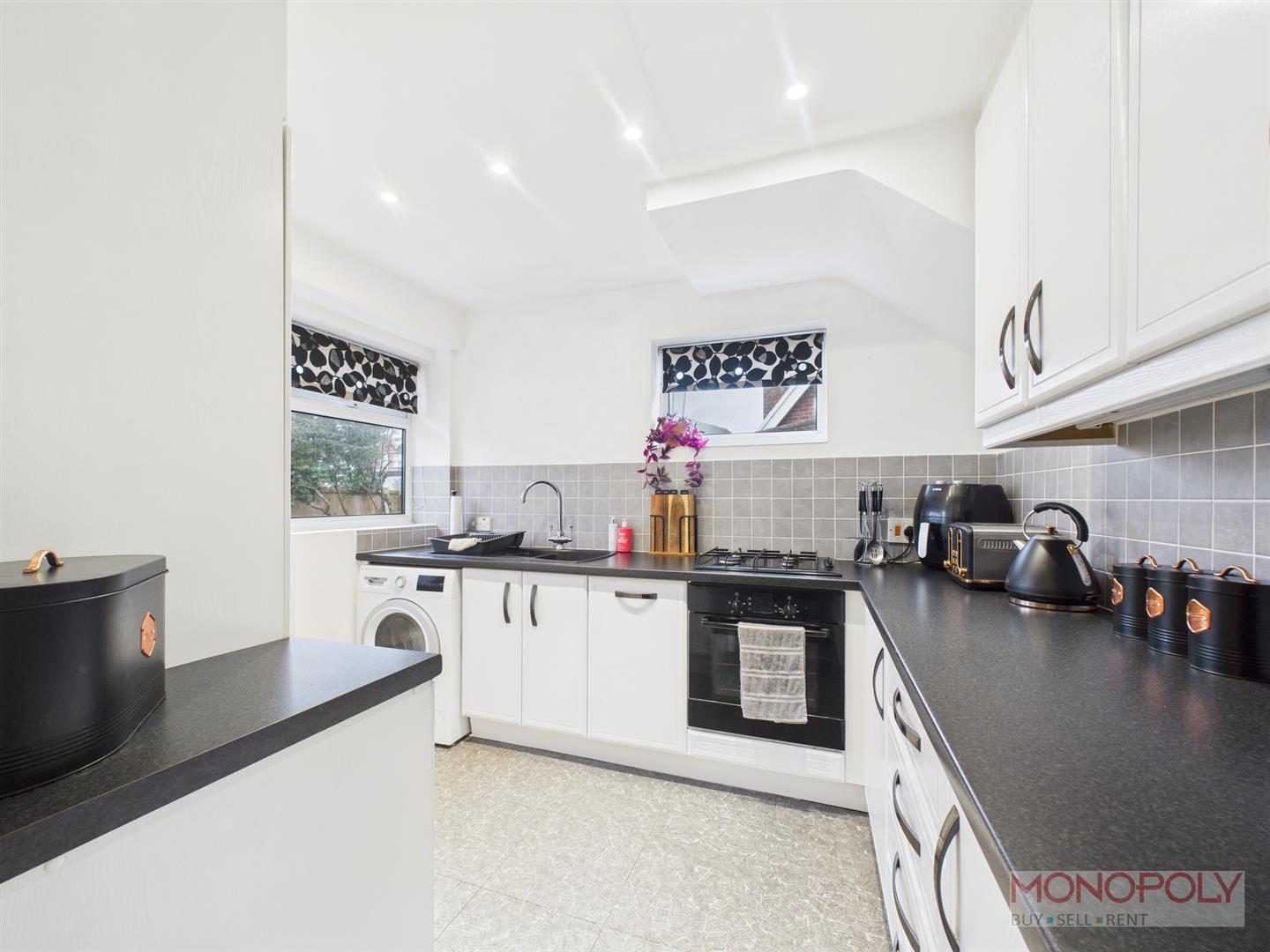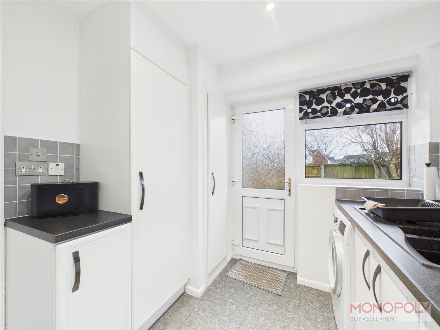 Modern kitchen housing a range of wall, drawer and base units with complimentary work surface over. Integrated appliances to include electric oven, gas hob, floor to ceiling fridge and dishwasher. 1.5 composite sink unit with mixer tap. Space and plumbing for washing machine, tiled floor, recessed LED lighting, tiled splash back, uPVC double glazed window to the side and rear, uPVC double glazed frosted door to the rear.