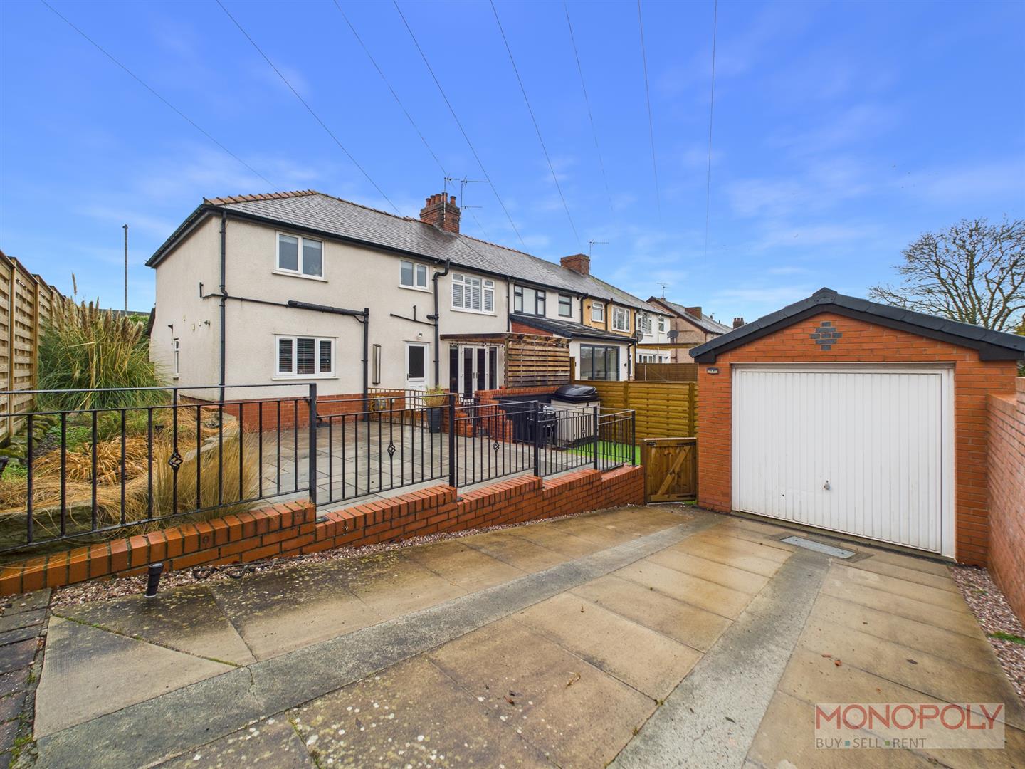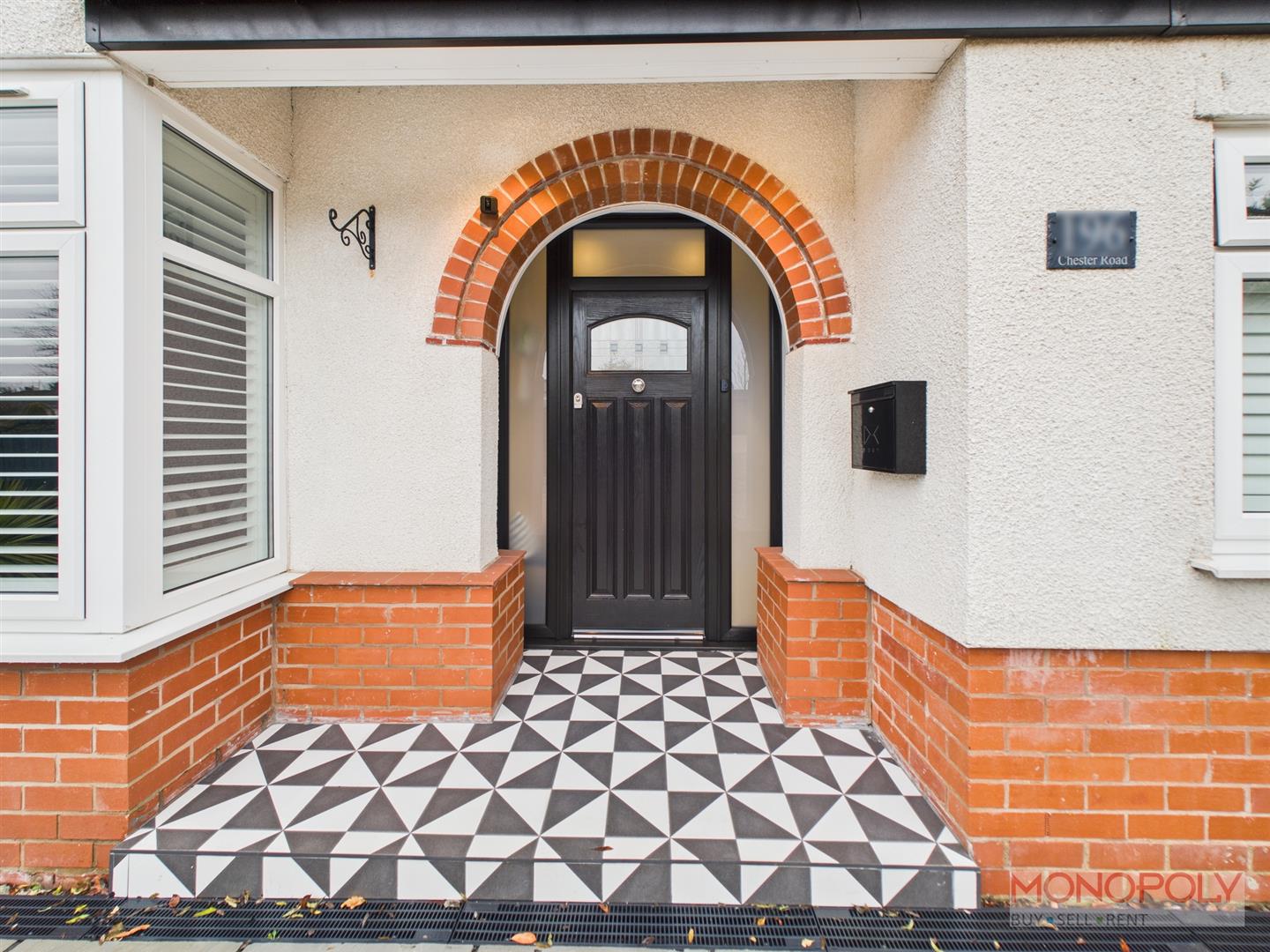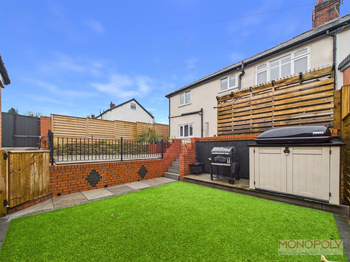 Rear - Low maintenance rear garden, patio with pergola adjacent the rear of the house. Steps down toa further garden area with artificial grass and paved path to rear parking area and garage. Enclosed with fencing to both sides and brick wall to rear.