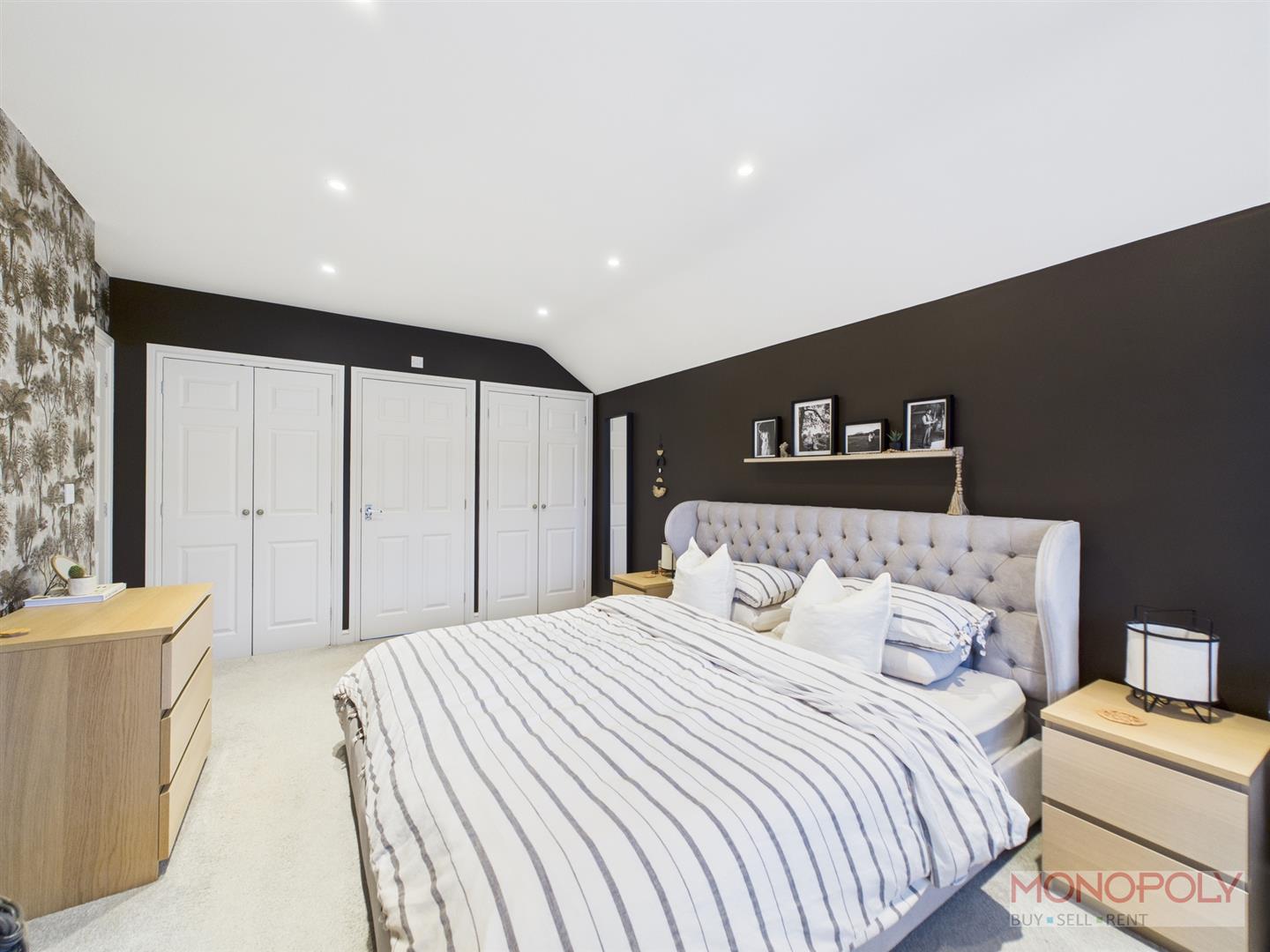 A spacious principal bedroom suite with carpeted flooring and window to front. Two double built in wardrobes and door to en suite.