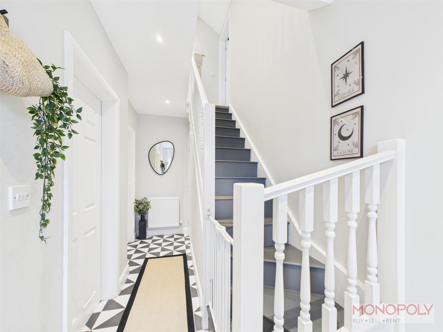 Tiled, flooring, stairs rising to the first floor, doors to two receptions rooms, wc and kitchen/diner.
