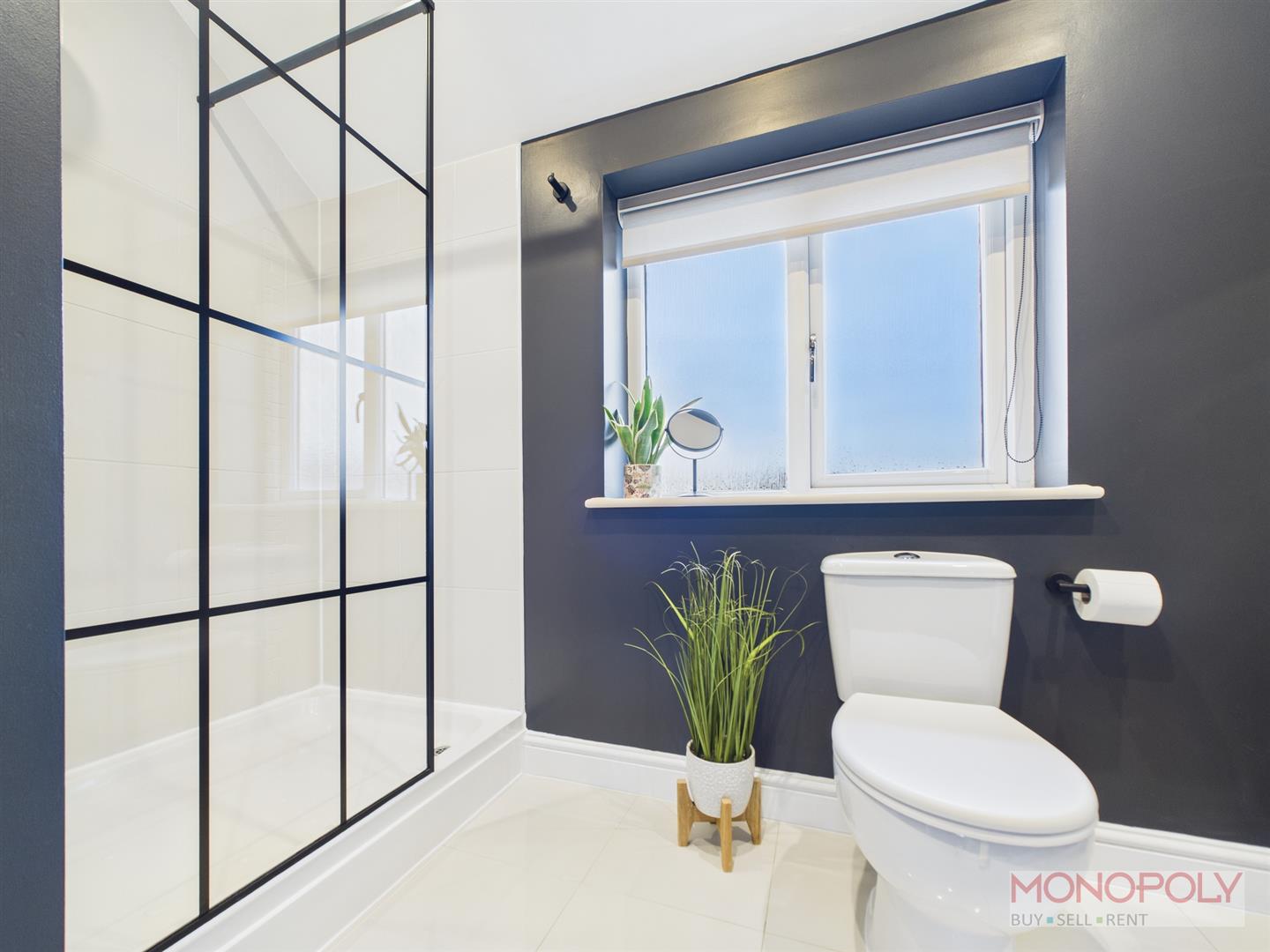 Stylish contemporary en suite, with walk in shower enclosure, wc, hand wash basin, frosted window to rear, chrome towel rail, tiled flooring, spotlights, extractor.
