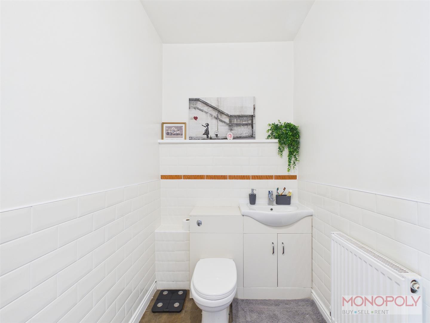 Low level wc, hand wash basin, tiled flooring.