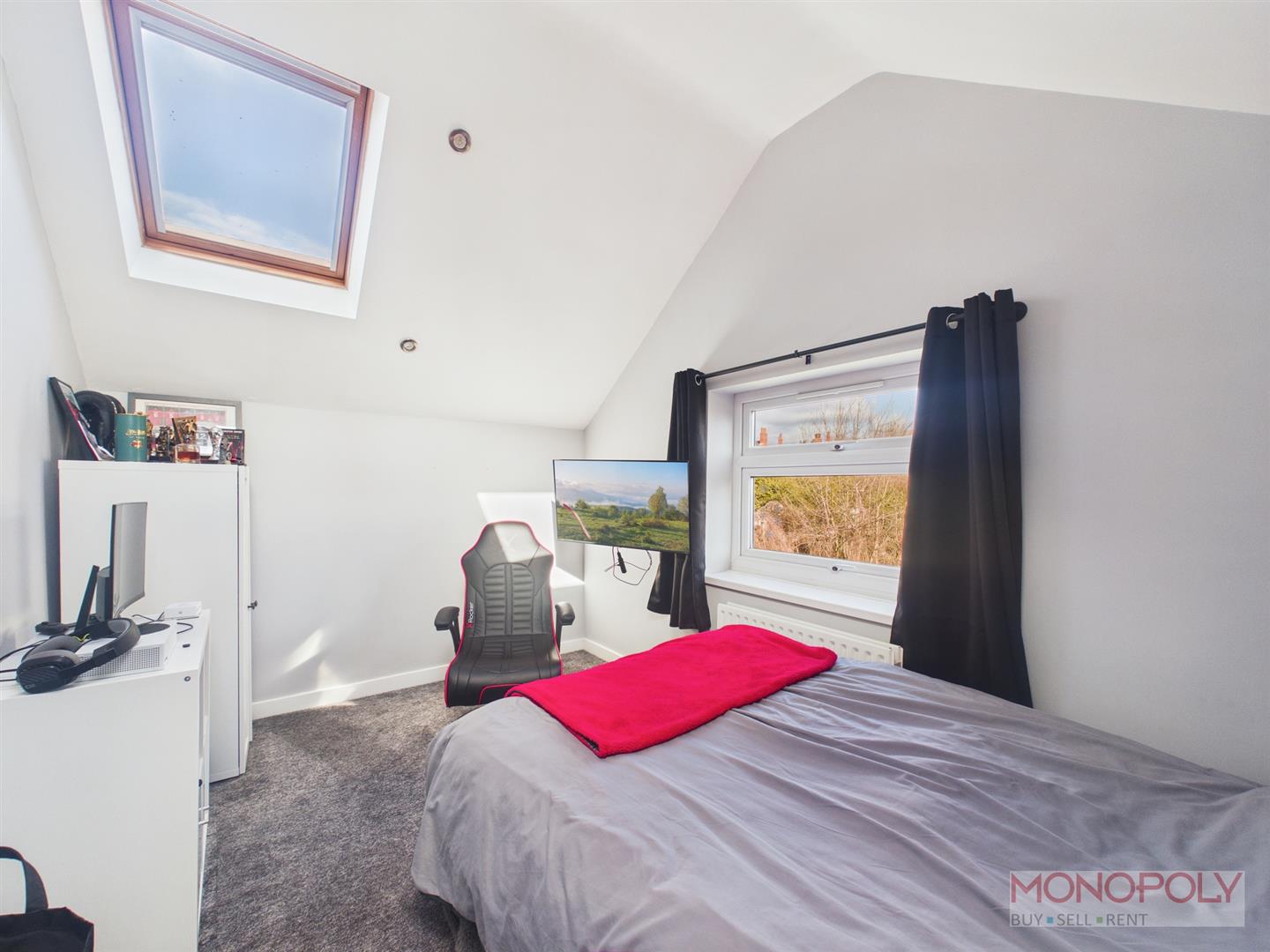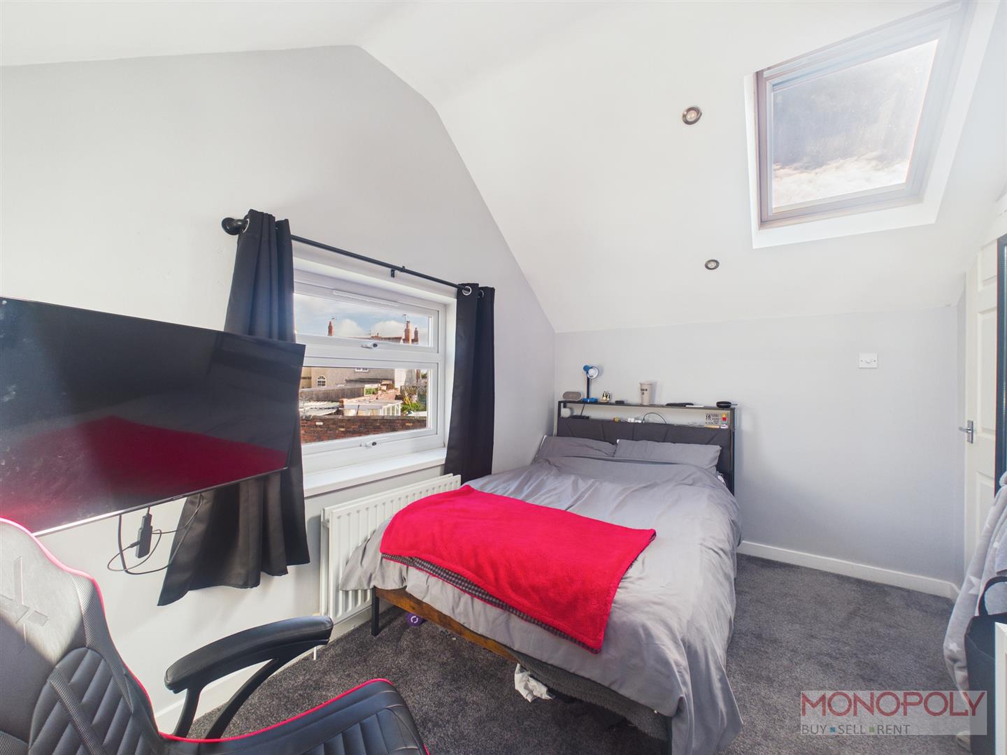 Two Velux roof light windows within raised ceiling, upvc double glazed window to rear, radiator inset ceiling spotlights, carpet.