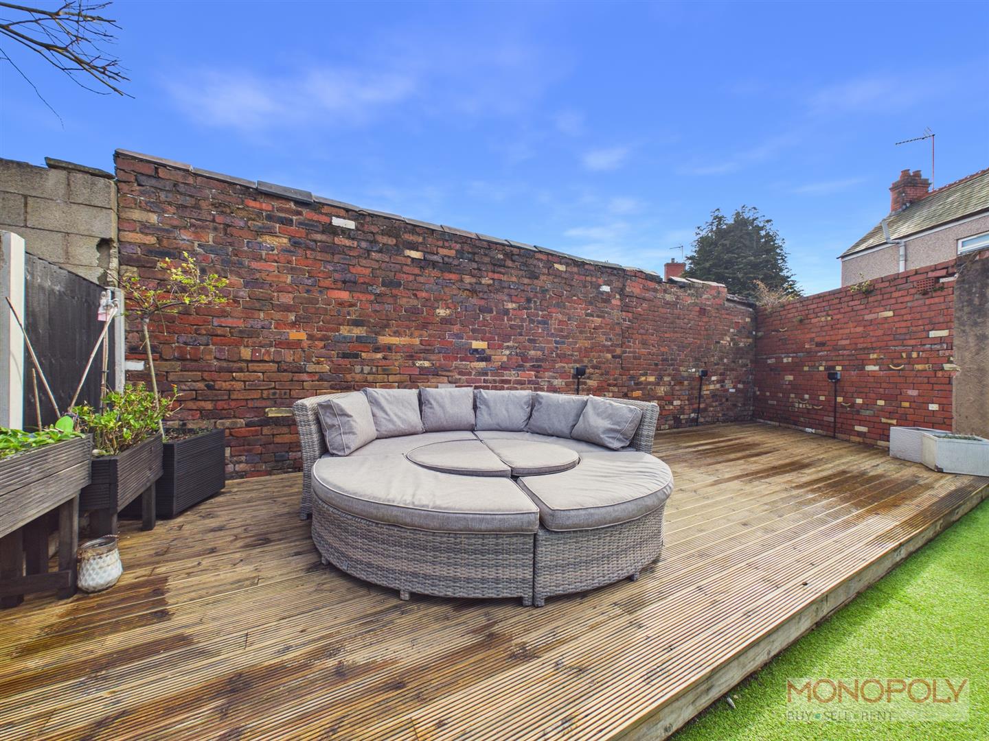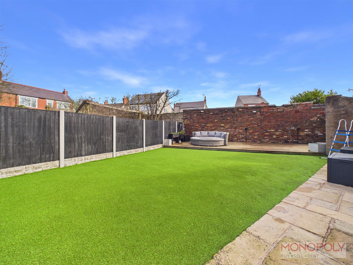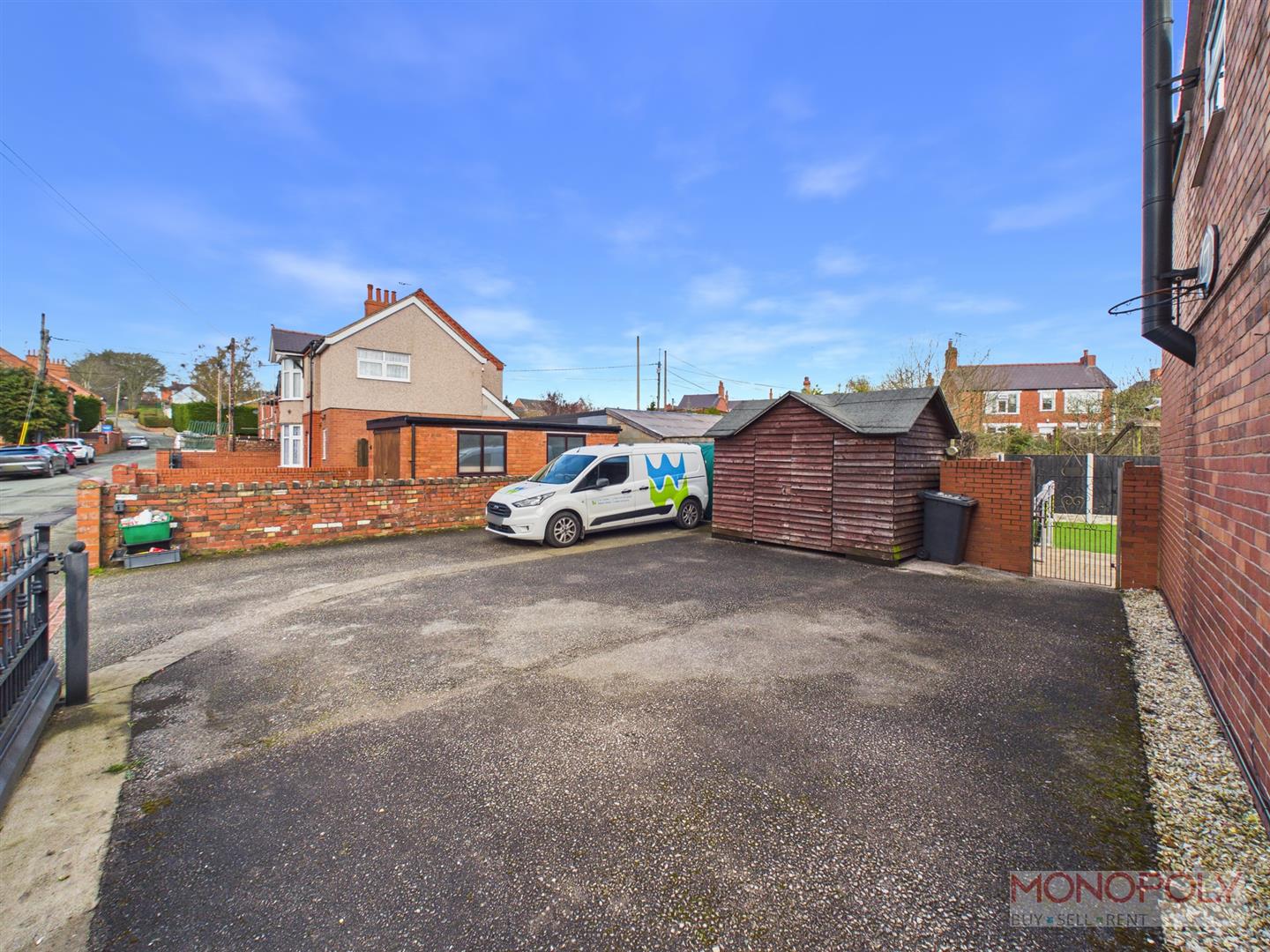 The property is approached through a sliding metal gate opening to the private driveway providing parking for four cars with paved path off leading to the entrance door, pedestrian metal gate on brick pillars, low level front brick built boundary wall, ev charger and good sized timber storage shed. Gated access to the side leads to the rear garden which provides an excellent outdoor entertaining area for both adults and children and includes a stone paved patio with artificial grass beyond, timber decked patio and useful electric socket.