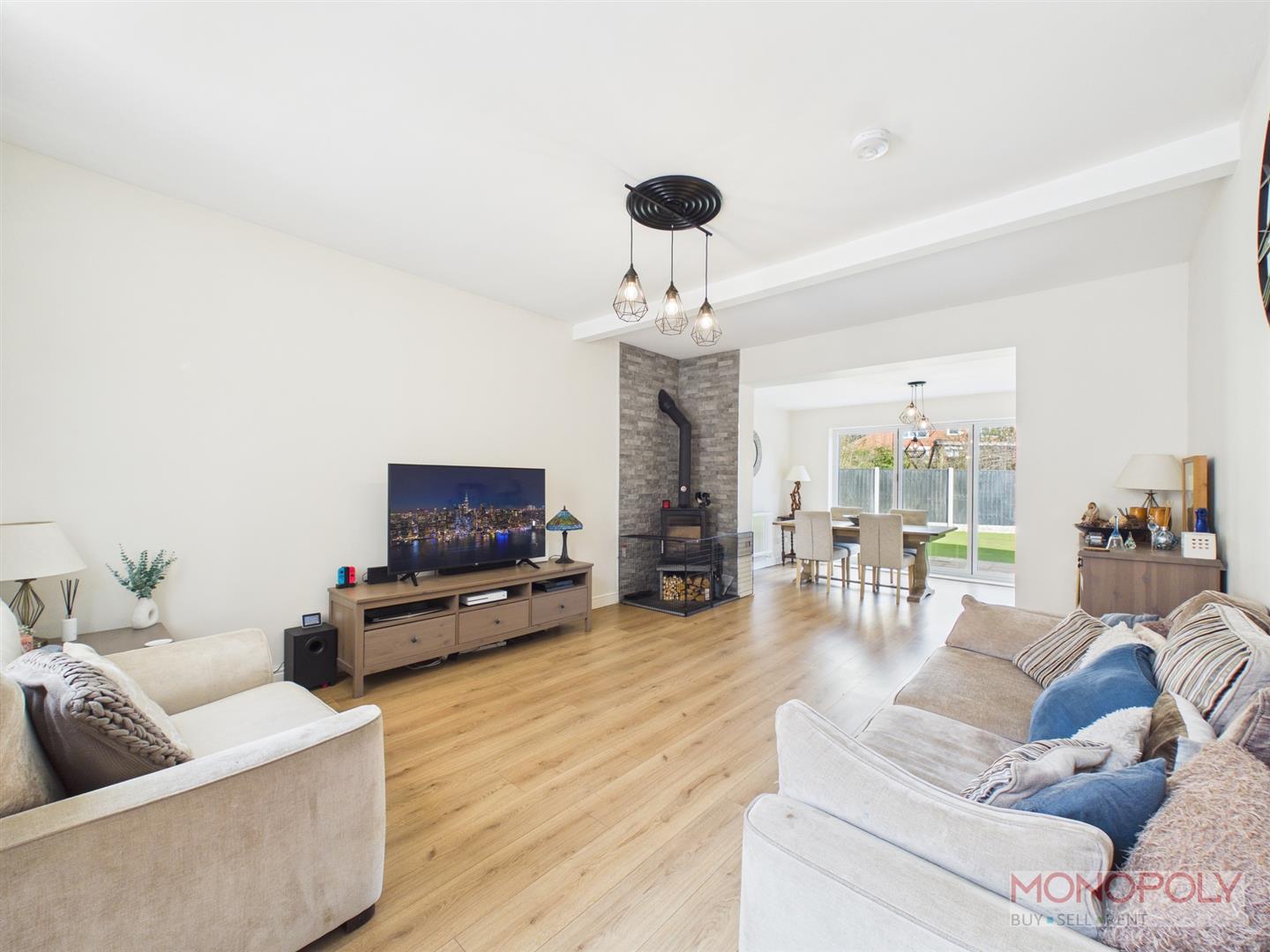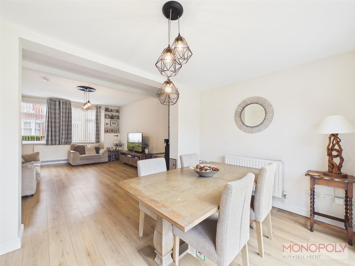 A spacious reception room having wood style flooring, two upvc double glazed windows to front, radiator, log burner with tiled feature wall to surround and limestone hearth, fitted shelving, storage cupboard and an open aspect to the dining area with aluminium bi-fold doors opening to the rear garden, radiator and oak veneer door to the kitchen.