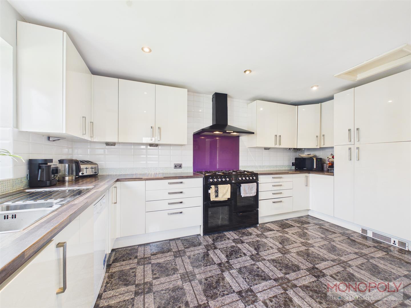 Fitted with a range of base and wall cupboards complimented by wood effect tops areas inset stainless steel 1 1/2 bowl sink unit with mixer tap and upvc double glazed window above overlooking the rear garden, seven burner gas Range cooker with splashback and extractor hood above, plumbing for washing machine, plumbing for dishwasher, space for tumble dryer, housing for American style fridge freezer, part tiled walls, concealed Worcester gas combination boiler, tiled flooring, inset ceiling spotlights. Door to inner hall.