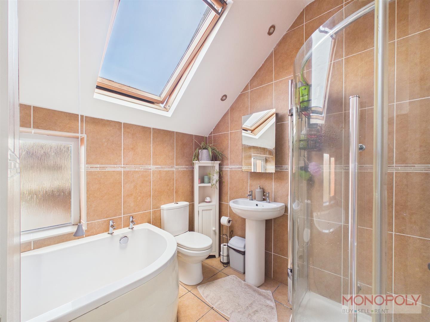 Corner shower enclosure with mains thermostatic shower and Drench style shower head, pedestal wash basin, low flush w.c, bath, fully tiled walls, Velux roof light window, inset ceiling spotlights, tiled flooring and chrome heated towel rail