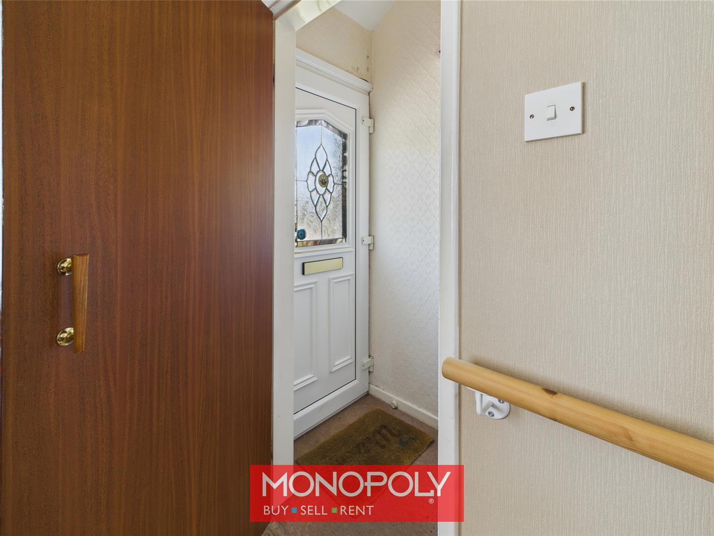 The entrance to the property features a modern UPVC front door with a decorative glass panel. Inside, a short hallway leads to the bottom of the carpeted staircase, which includes a wooden handrail and a fitted chairlift for easy access. To the right of the entrance is a door leading into the lounge.
