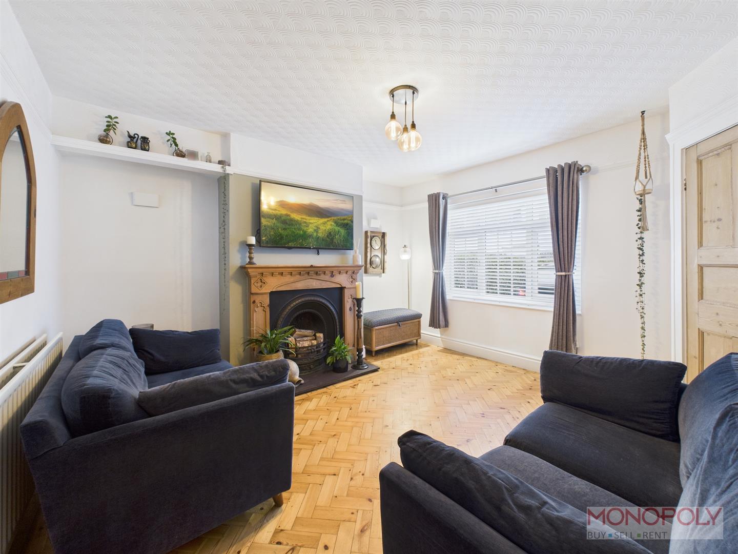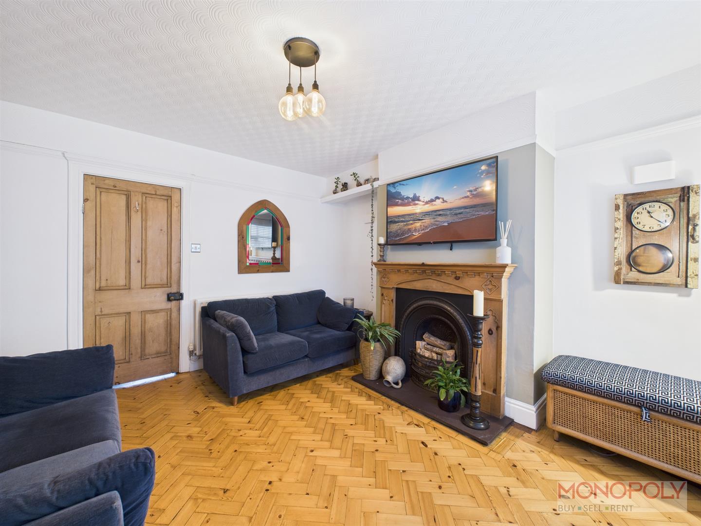 Feature cast iron fire place with timber surround and slate hearth. Timber parquet flooring, window to front, understairs storage with shelving.