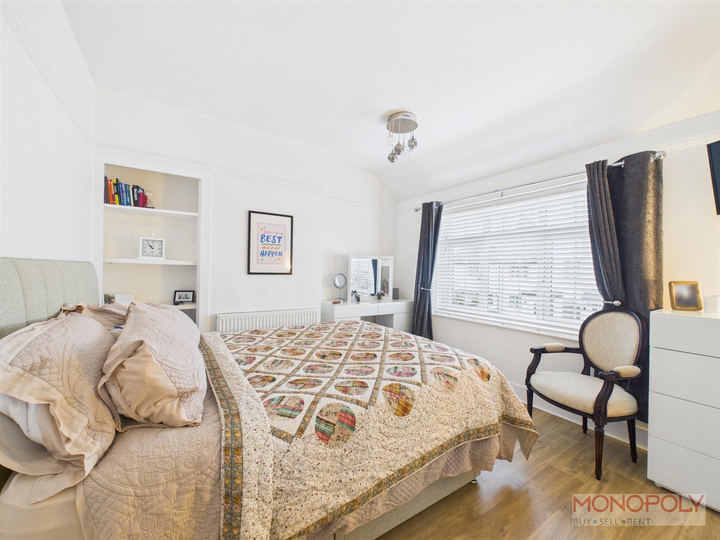 Double bedroom with timber effect flooring, built in wardrobe with rails, window to front, inset alcove with shelving.