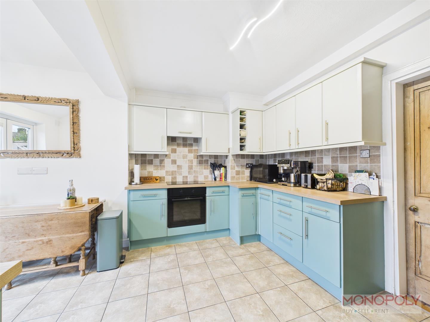 Fitted range of wall and base units with timber effect worktops, electric hob, single oven, extractor, tiled splashback, inset sink drainer with mixer taps, space and plumbing for washing machine and dishwasher, tiled flooring, French doors to rear garden, original timber door to porch