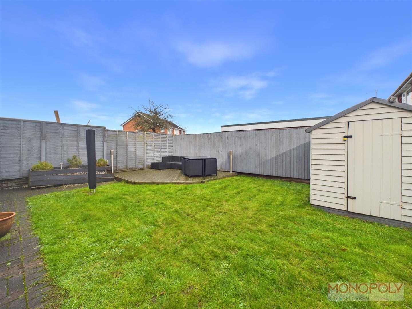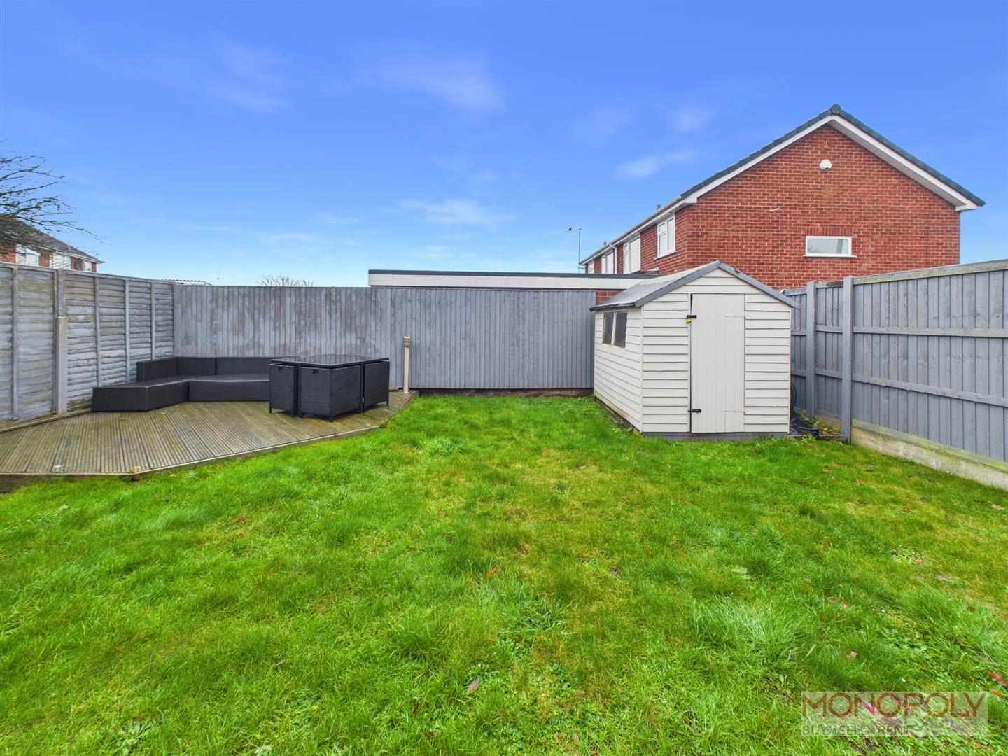 The rear garden is largely laid to lawn with a decked patio area, garden timber shed, and is made private with panel enclosed fencing.