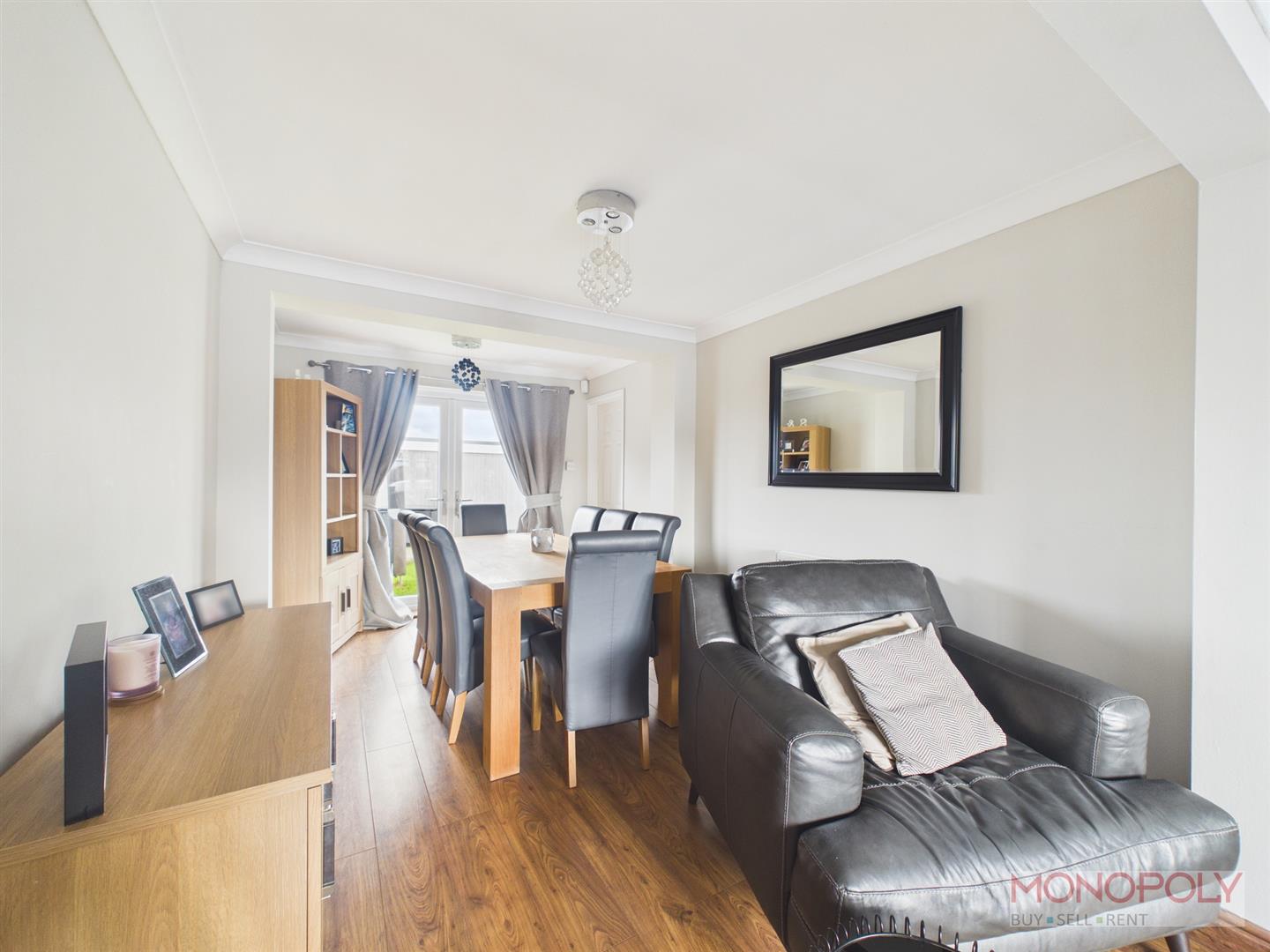 UPVC Double glazed window to the front, radiator, wall mounted electric fire, laminate flooring. In the dining area: UPVC Double glazed French Style doors to the rear garden, laminate flooring, radiator, door giving access to the kitchen.
