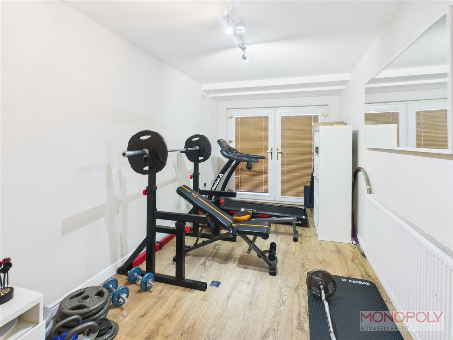 Multi use room currently being used as a gym, with laminate flooring, half height tiled walls, radiator, and UPVC Double-glazed French doors opening to the front.