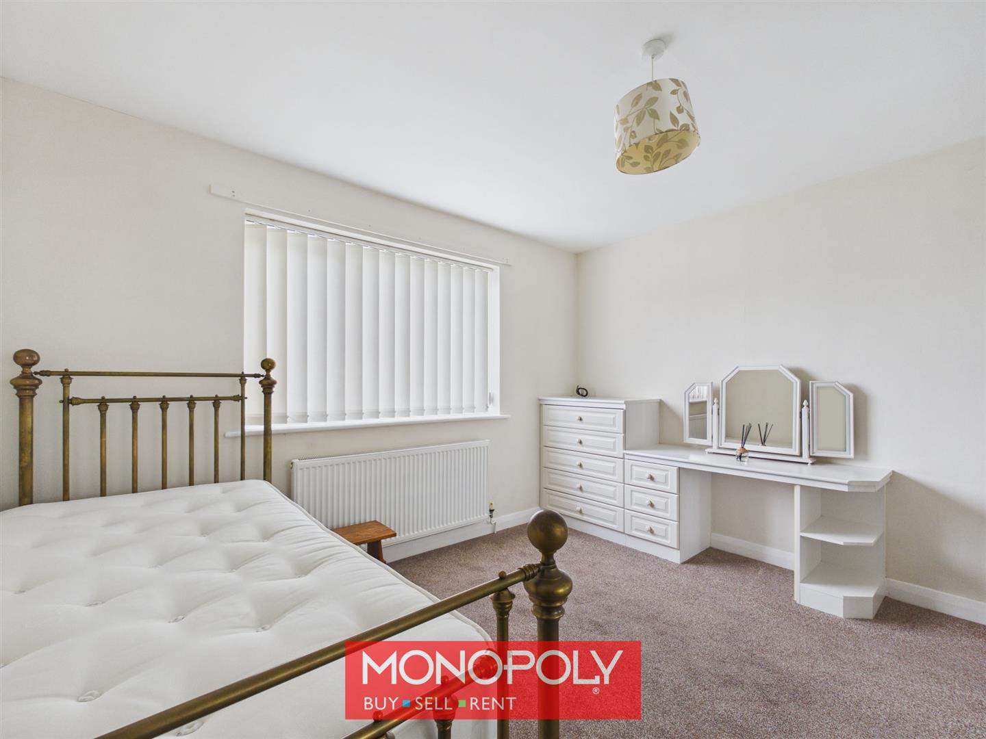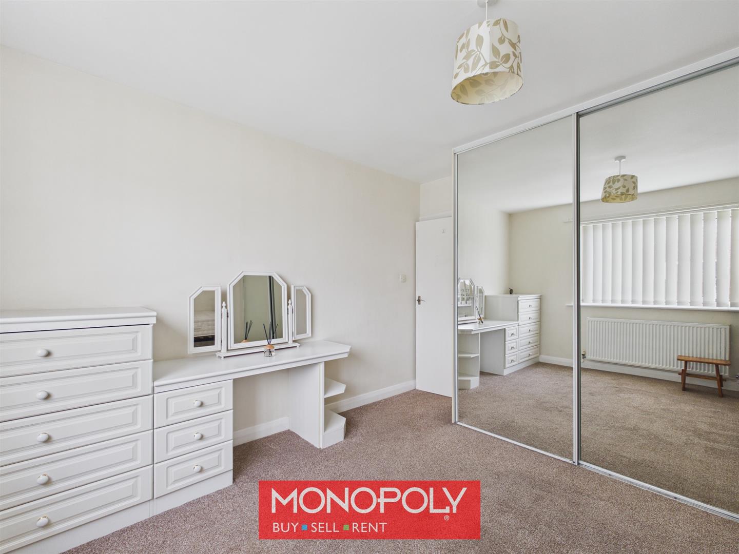 A large master bedroom with built-in mirror fronted triple wardrobe, built-in chest of drawers and dressing table. Carpeted flooring, radiator and a uPVC double-glazed window overlooking the rear garden.