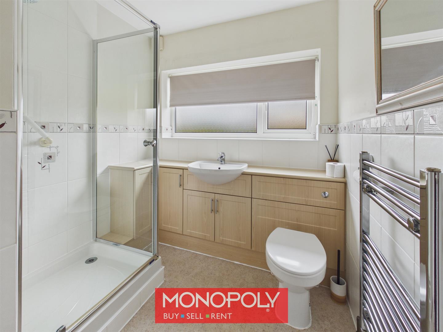 Well-appointed bathroom fitted with a modern white three-piece suite comprising a shower enclosure, vanity unit with hand wash basin and WC, part tiled walls with decorative border, vinyl flooring, heated chrome towel rail, airing cupboard, and privacy uPVC double-glazed window overlooking the side of the property.