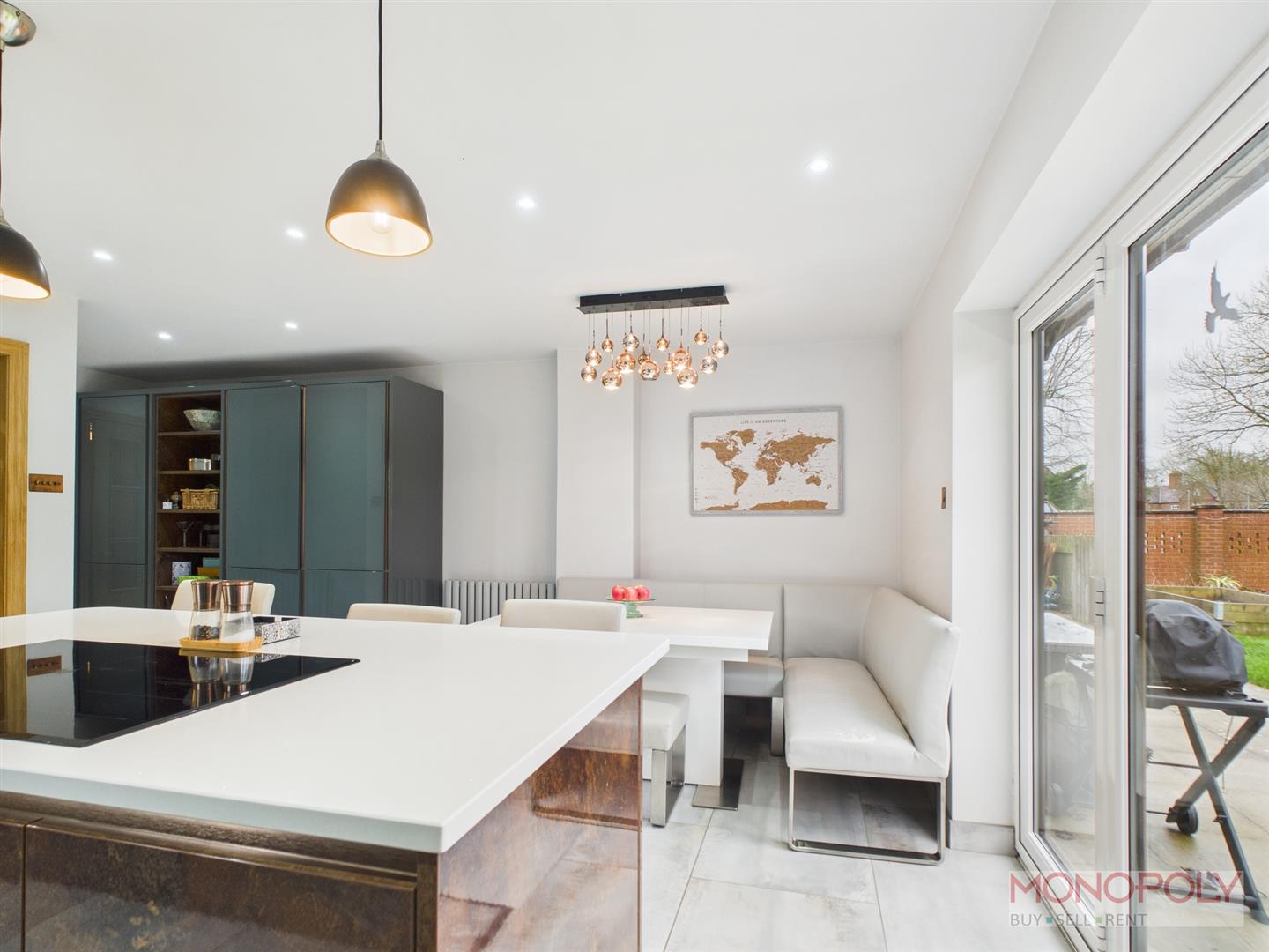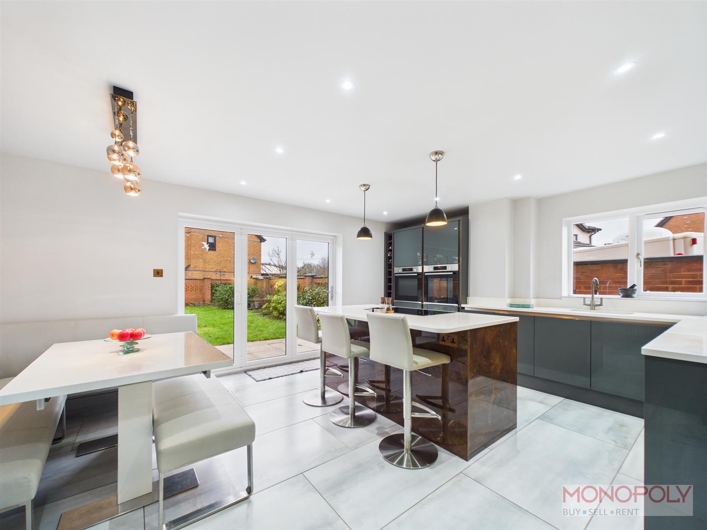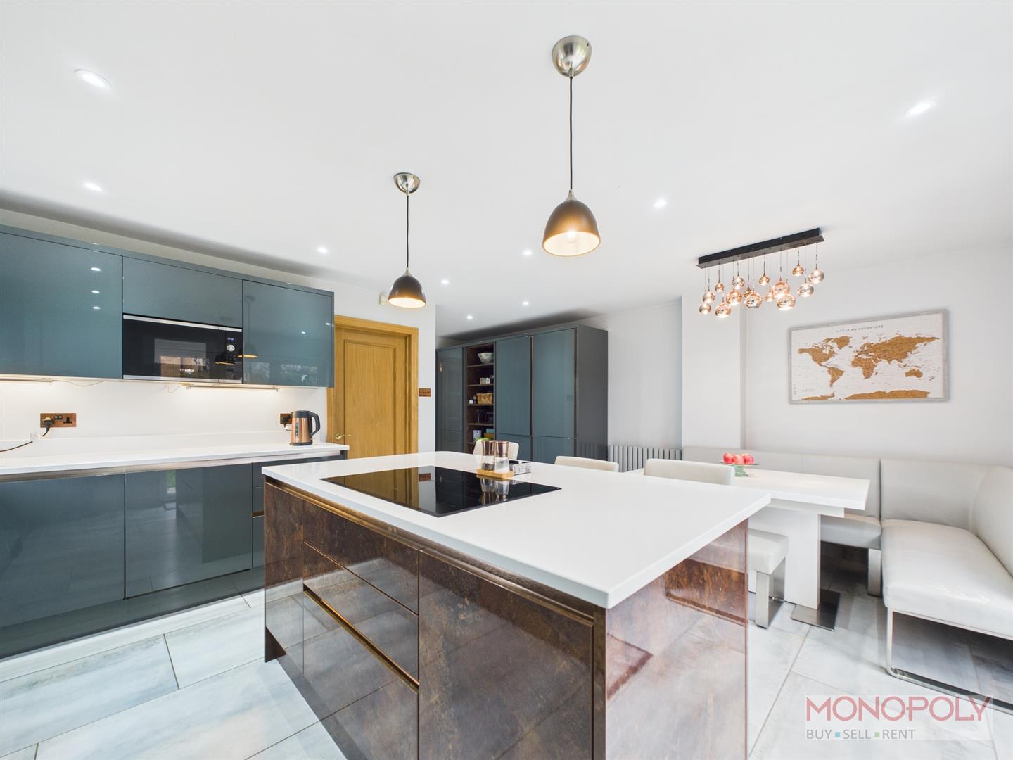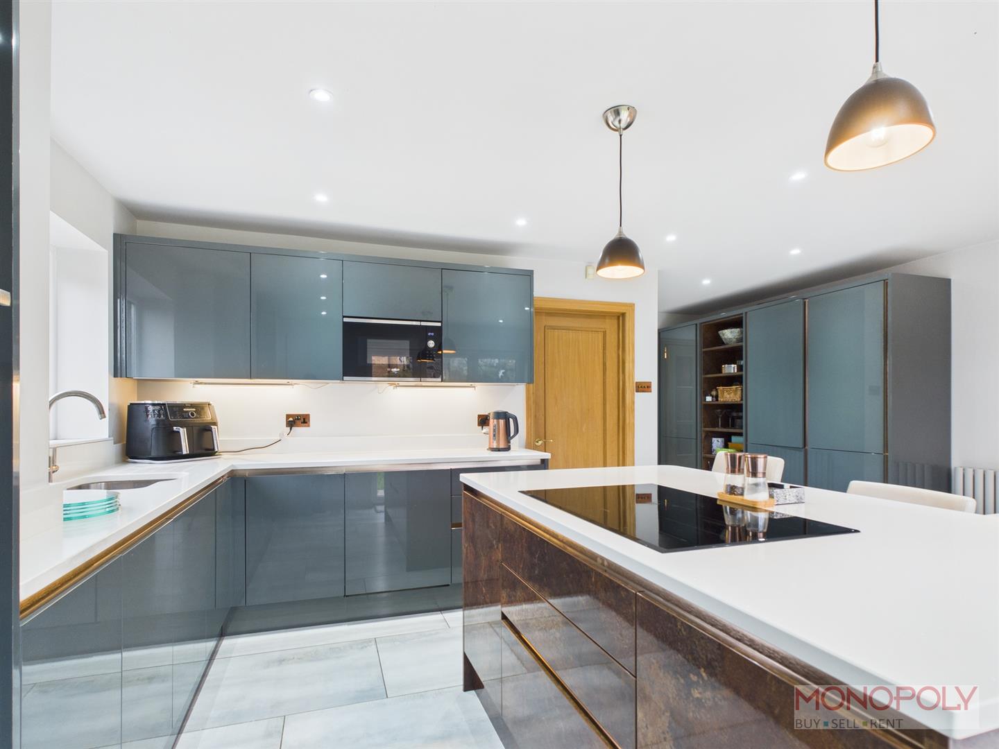 Striking contemporary kitchen fitted in 2020. Wide range of Dark Grey high gloss wall, base and drawer units with white quartz work top and breakfast bar. Integrated 2 x ovens, microwave, dishwasher and fridge/freezer plus 5 ring hob built into the island. Island with copper finish to the drawer fronts and end panels. Plenty of room for family table and chairs. Bi-fold doors to the garden, door to the utility. Tiled floor, window to the side with 1.25 inset sink unit beneath.