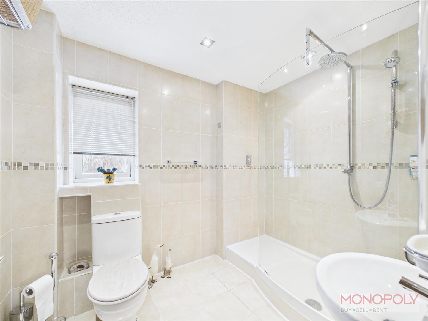Larger than average en-suite with walk in shower, toilet and wash hand basin. Fully tiled in travertine style tiling. Window to the side elevation.