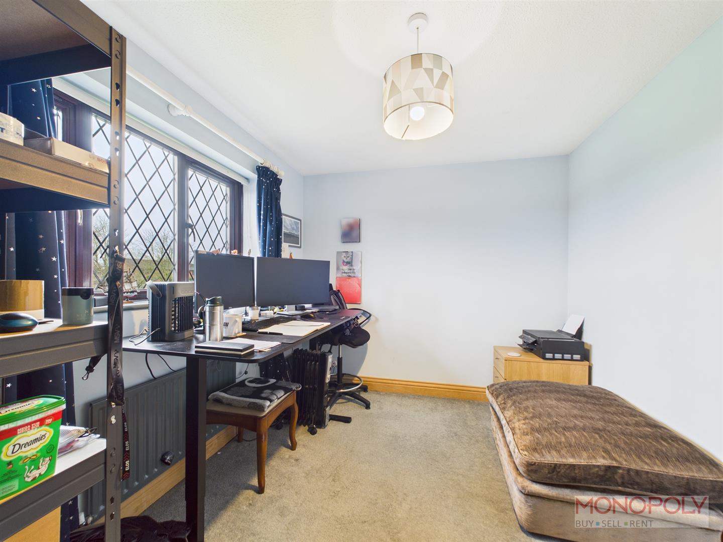 Smaller double bedroom with window to the front elevation. Currently used as a home office. Carpeted flooring.