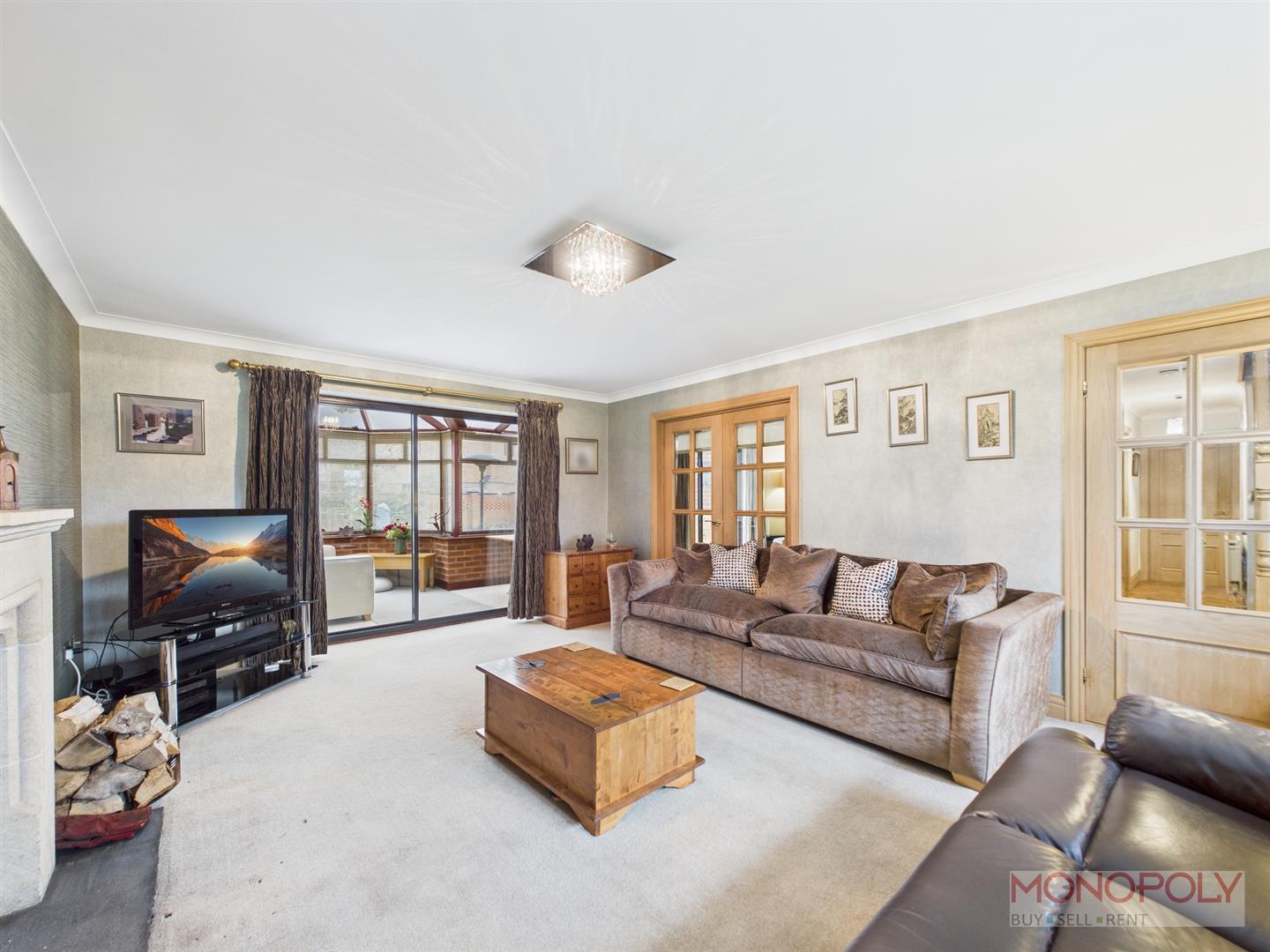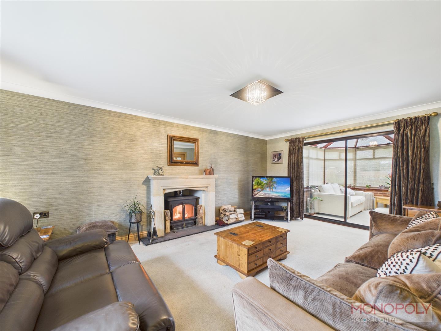 With feature fireplace and large log burner (which is linked in to the heating system therefore reducing the heating bills when lit). Patio doors to the conservatory, double doors to the dining room. Carpeted flooring, coving.