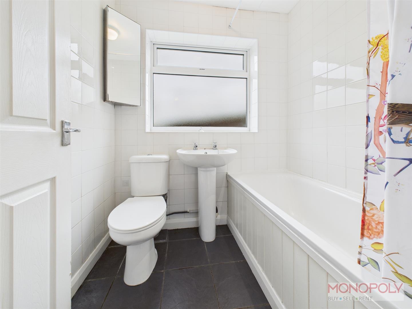 Three piece suite comprising low-level WC, pedestal wash hand basin and panelled bath with mains shower over. Finished with tiled flooring, tiled walls, fitted vanity unit, extractor, heated towel rail and uPVC double glazed frosted window to side.