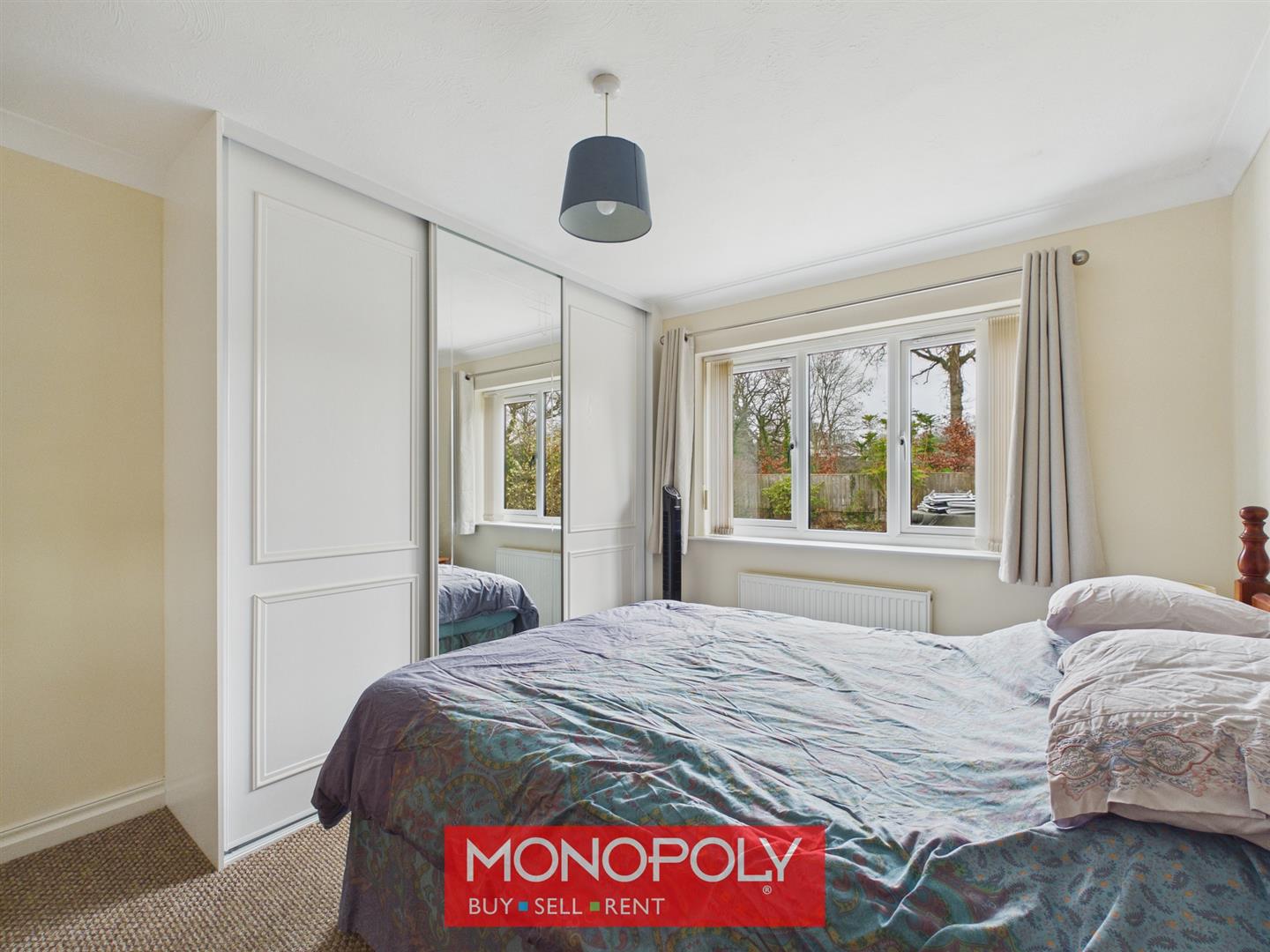 A well-proportioned double bedroom with carpeted flooring, fitted wardrobes with sliding doors (one mirrored), radiator, coved ceiling, and a double-glazed window overlooking the rear garden.