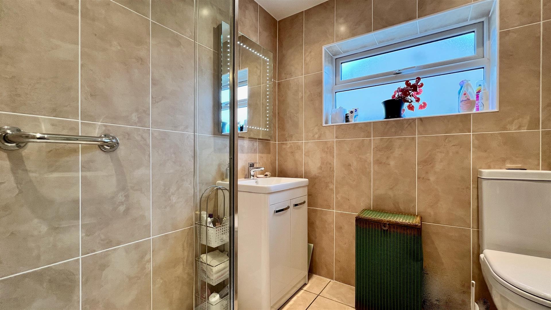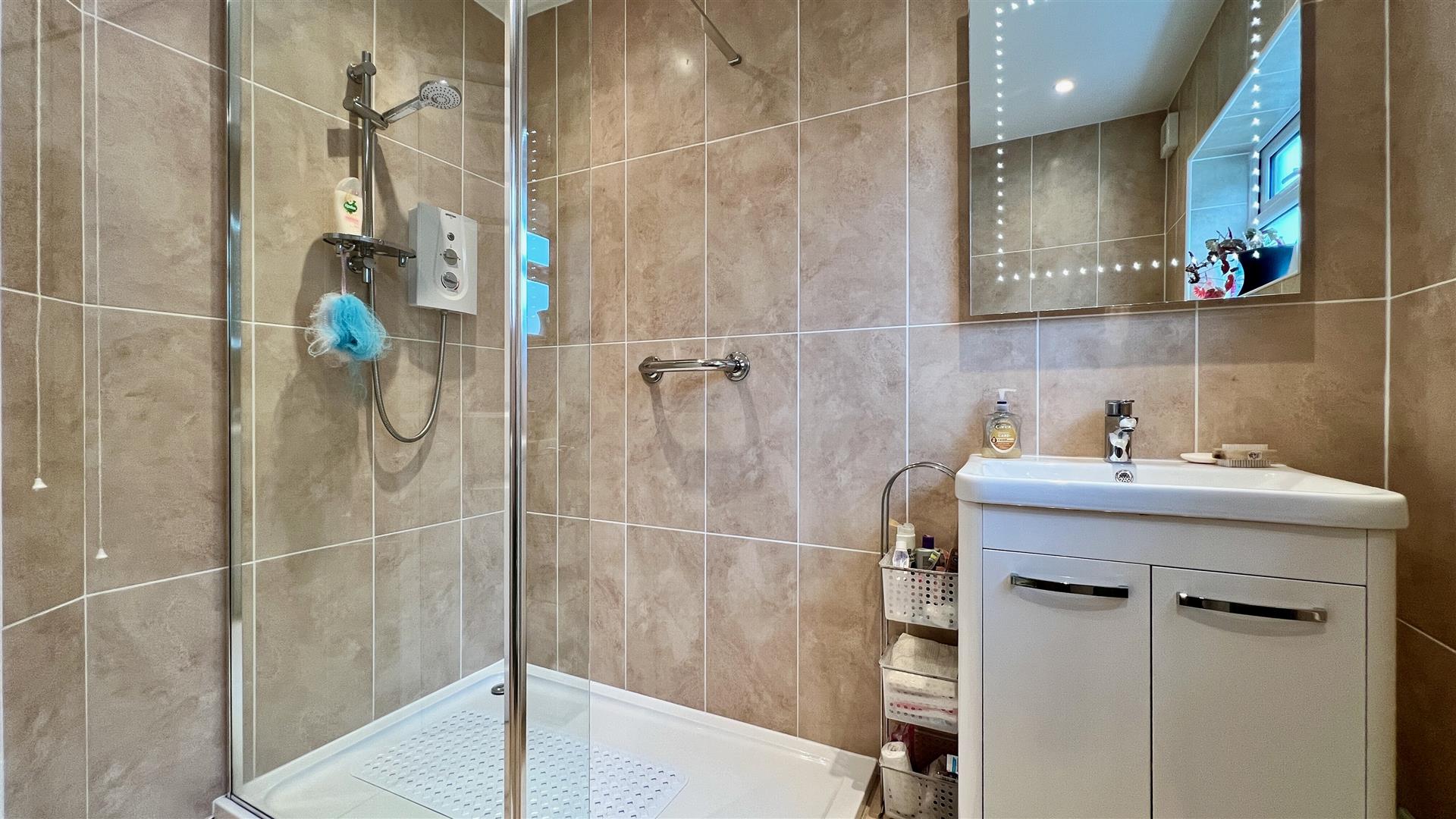 A contemporary shower room with large walk in shower, hand basin in vanity unit and low level WC. Fully tiled floor and walls, heated towel rail and LED mirror.