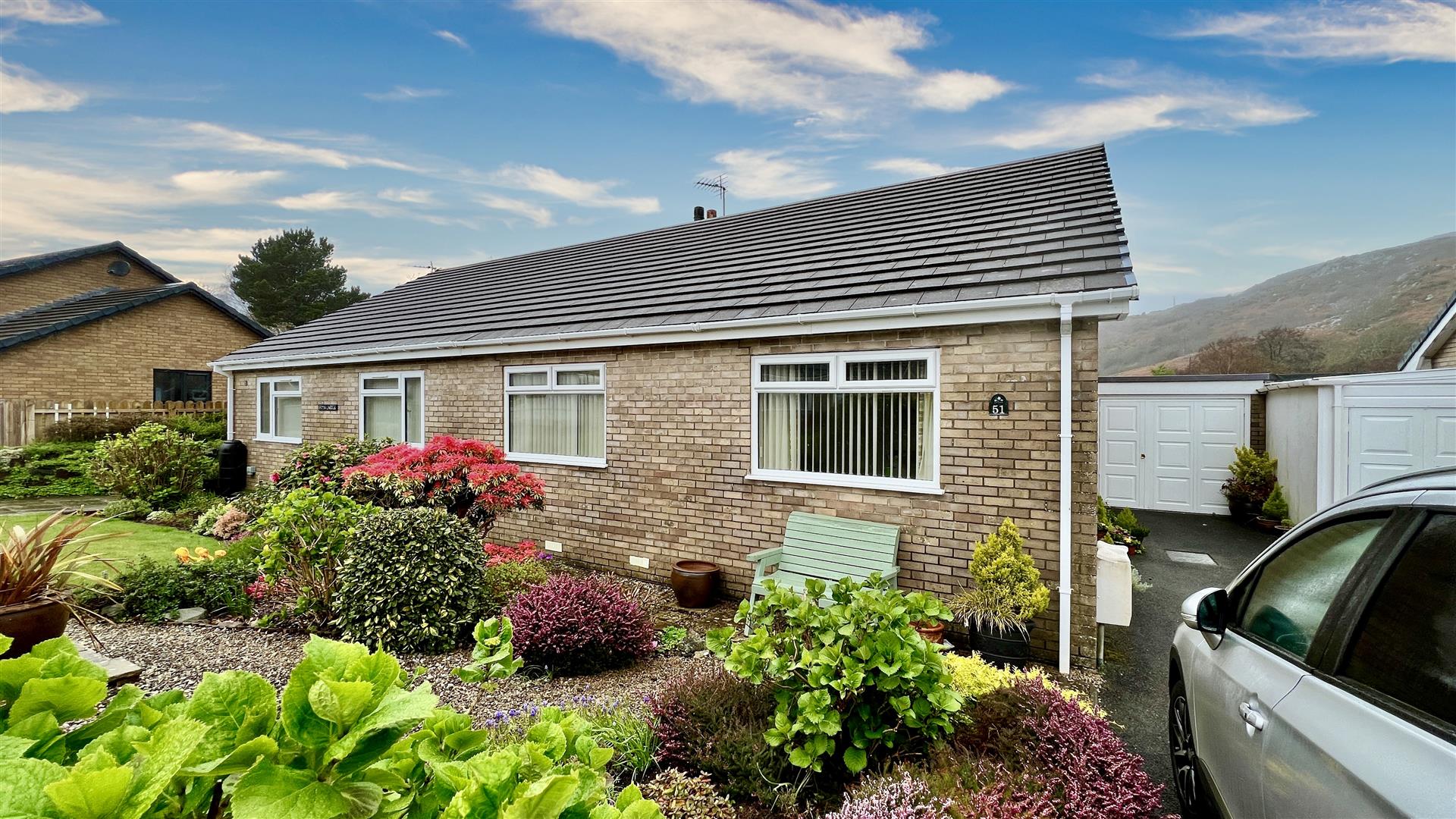 51 Ffordd Pentre Mynach is located on the edge of an extremely sought after development, this well maintained and well presented semi detached bungalow benefits from 2 double bedrooms, a light and airy living room, conservatory, kitchen and utility plus driveway parking and garage.