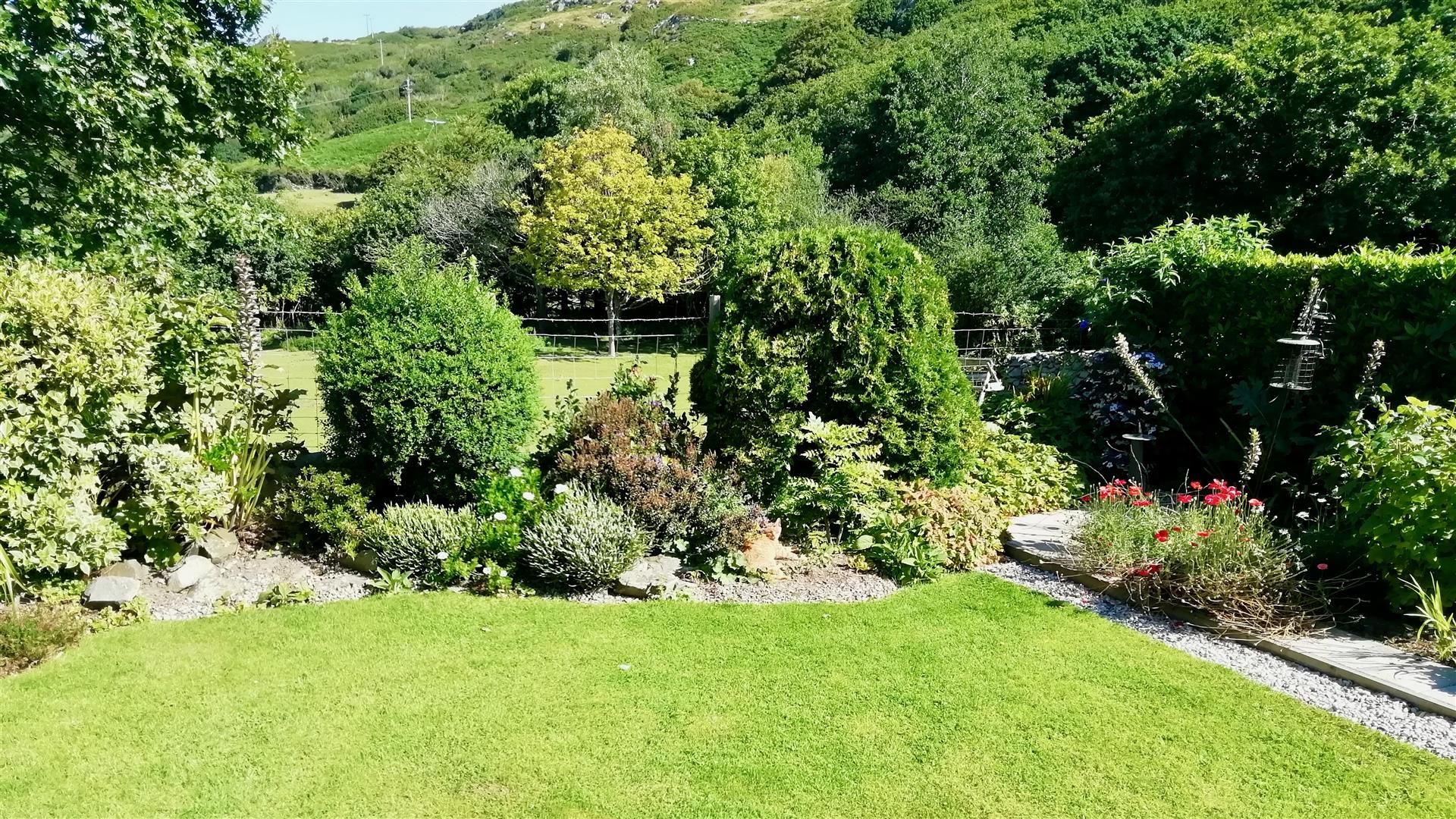 The rear garden is extremely special, private and secluded backing onto fields grazed by ponies and with craggy hillside to the right and views down to the sea and the Llyn peninsula over pasture land to the other side. The delightful garden has a raised patio and a few steps leading down to a well stocked garden laid to lawn with additional patio and with an abundance of mature trees, plants and shrubs. There is a storage area under the walkway from the utility.