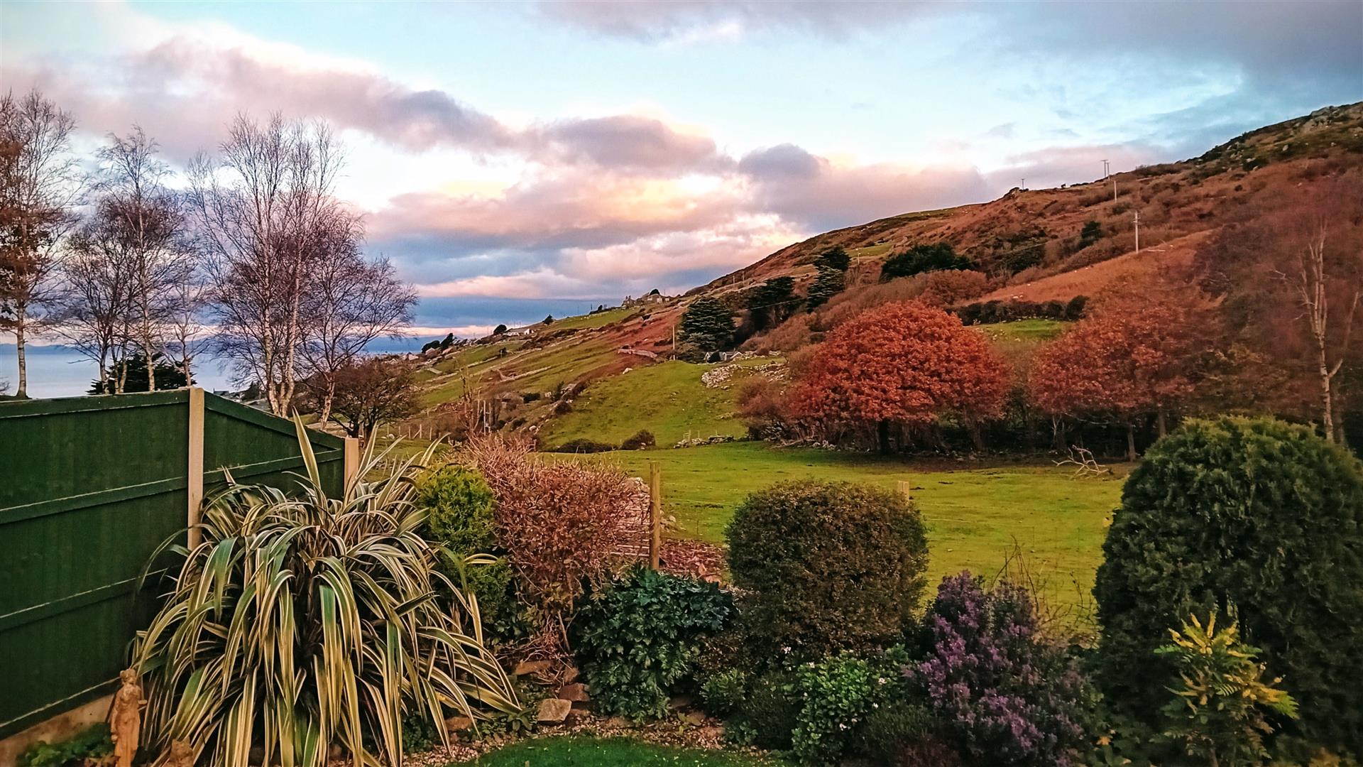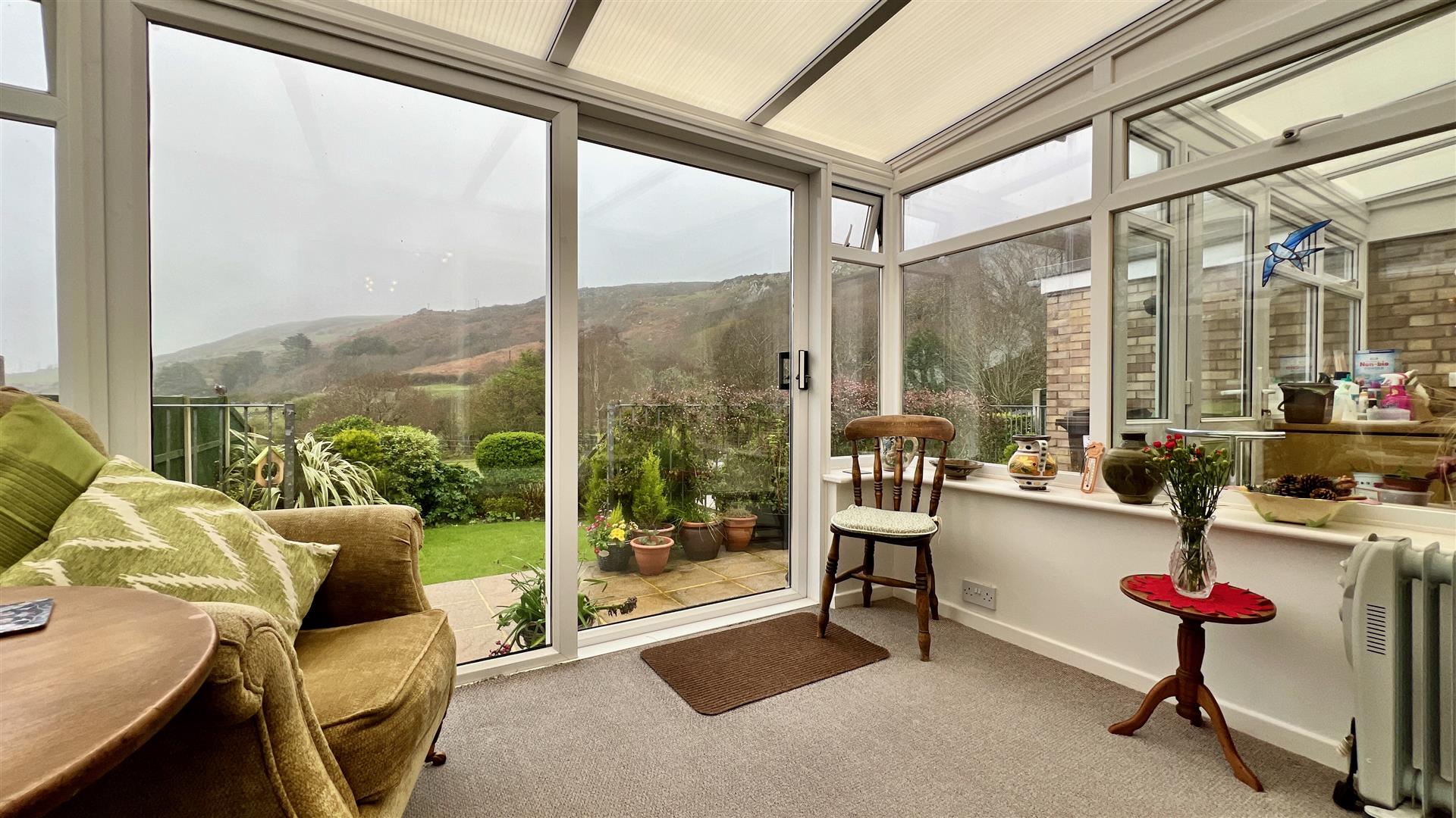 Patio doors from the lounge open to the conservatory which has sea, mountain, garden and pasture views. Doors lead to the raised patio bound by a balcony wrapped with clematis and to garden beyond.