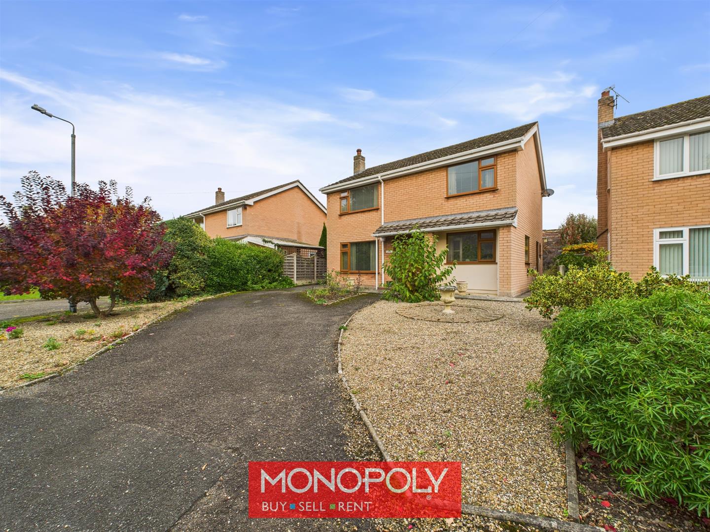 A tarmac driveway with lawn on either side offers space for up to 3 vehicles and leads to the single garage on the left-hand side. A pathway leads to the front door and onwards into the property.