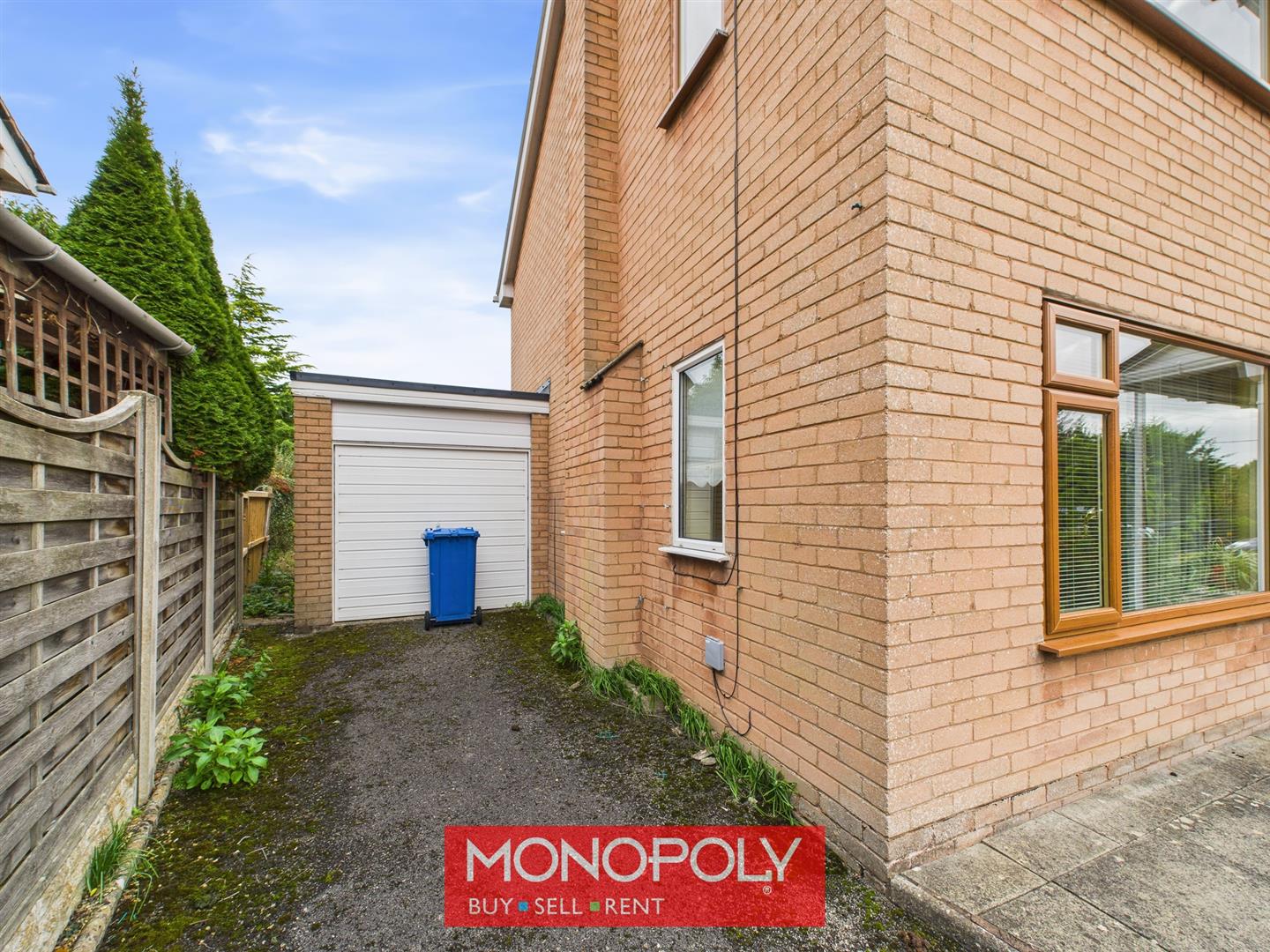 A low-maintenance garden with a slabbed area and stone-chipped areas. A brick wall to the rear of the garden maintains privacy with panelled fencing on either side. Paths lead to the front on both side of the property as well as a pedestrian door to the single garage.